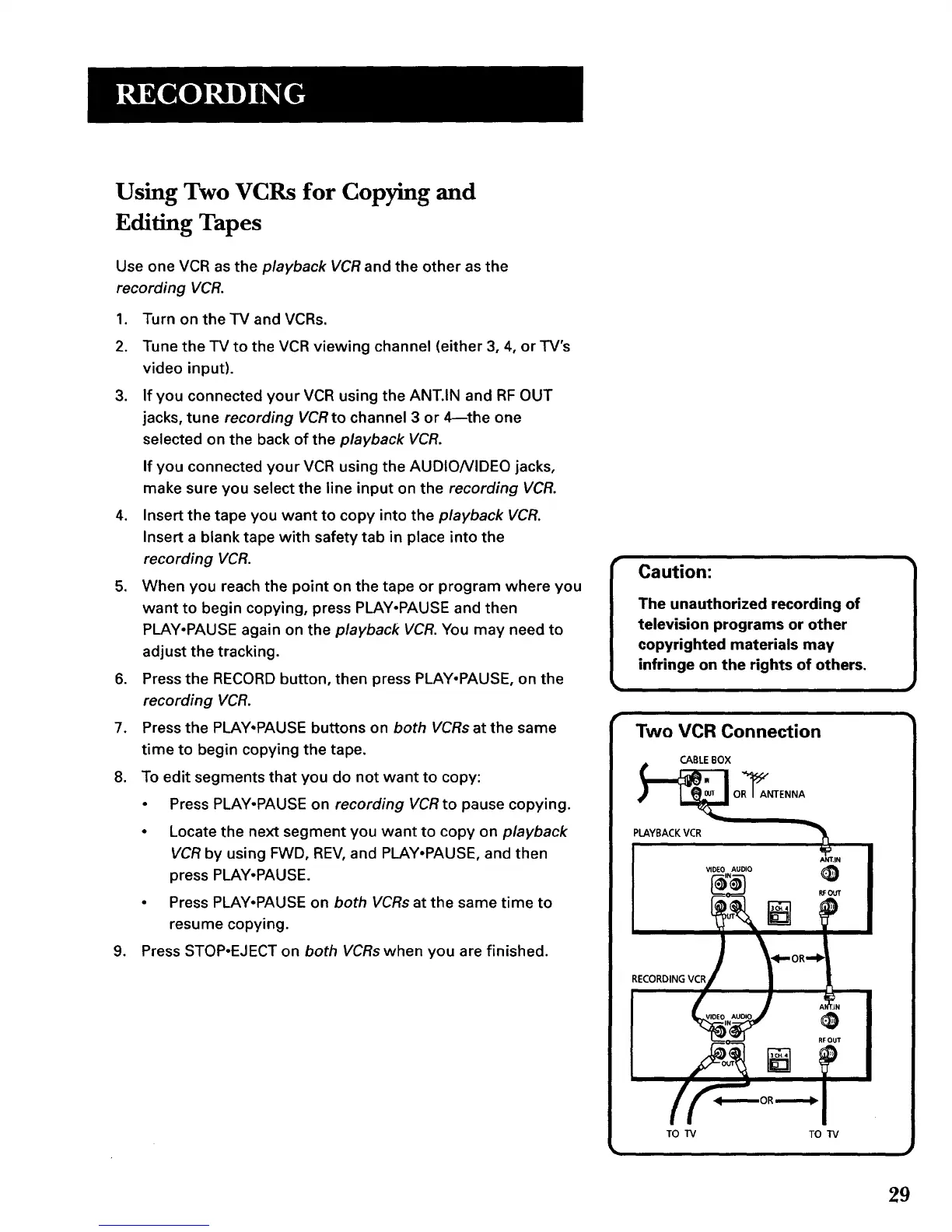 • Press PLAY-PAUSE on recording VCR to pause copying.