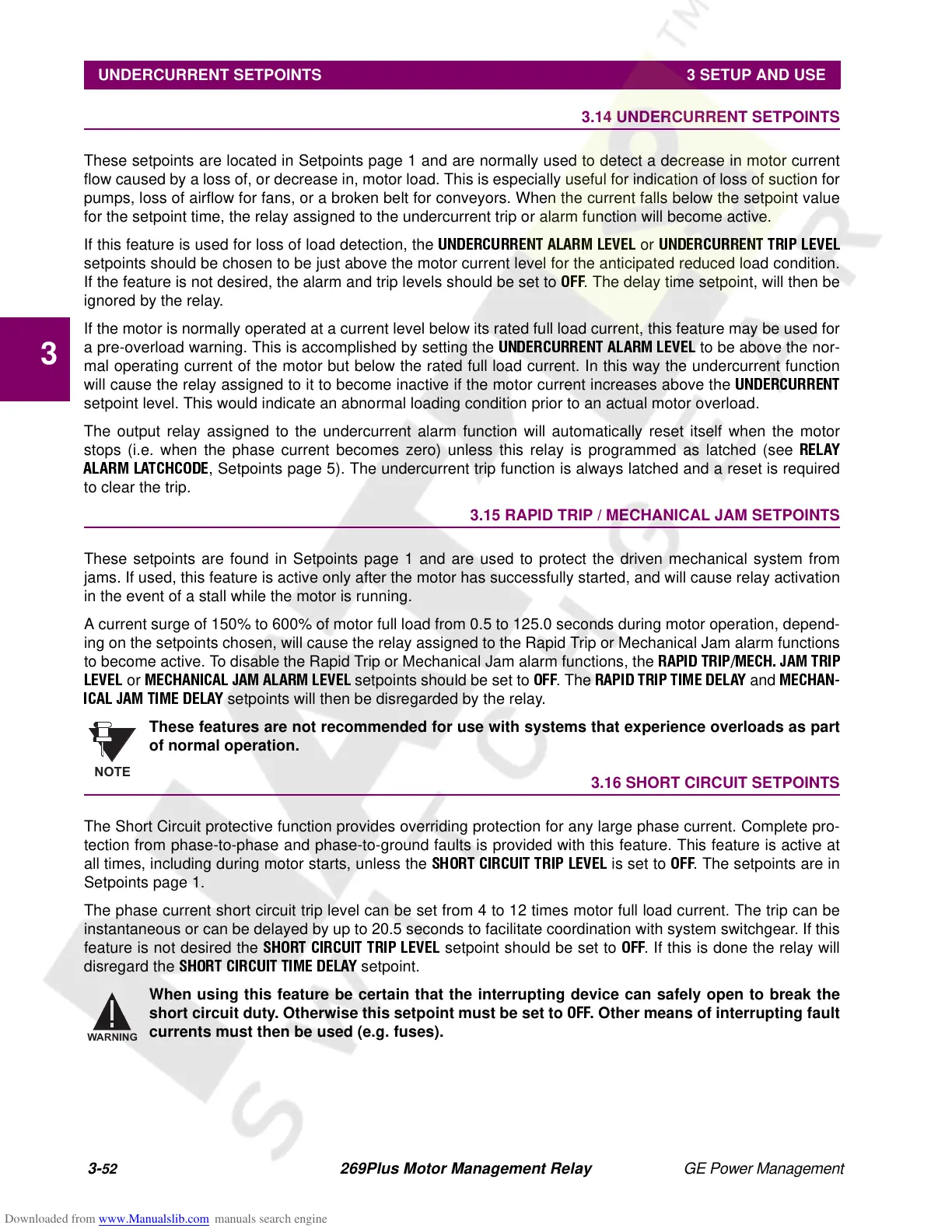 , Setpoints page 5). The undercurrent trip function is always latched and a reset is required