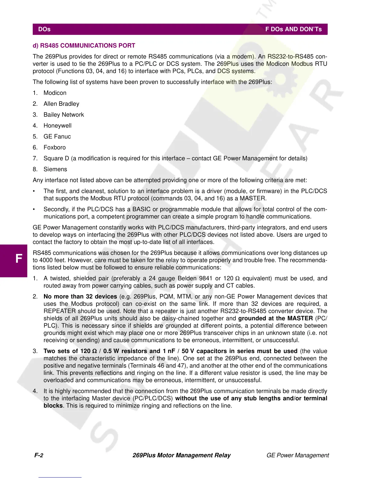 2. No more than 32 devices (e.g. 269Plus, PQM, MTM, or any non-GE Power Management devices that