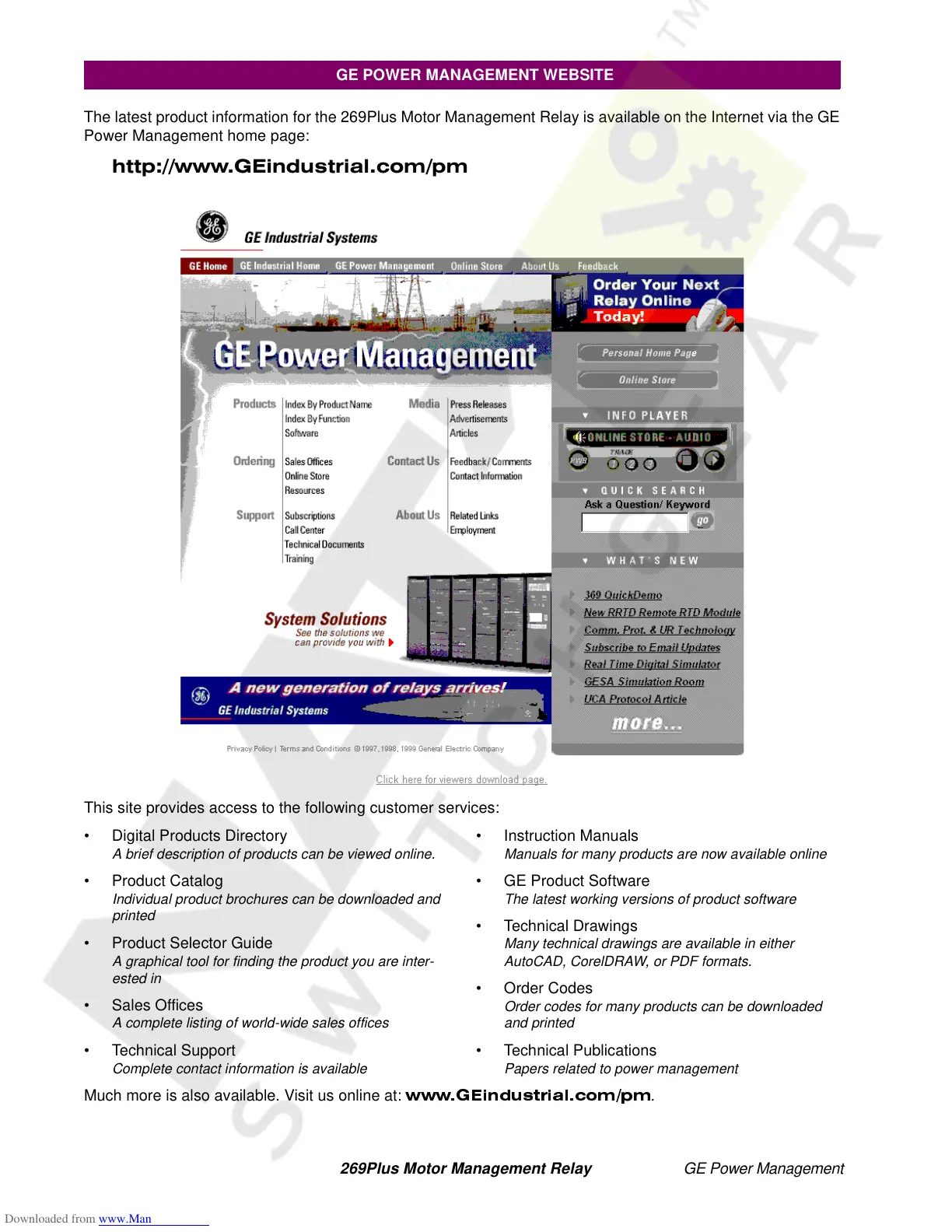 The latest product information for the 269Plus Motor Management Relay is available on the Internet via the GE