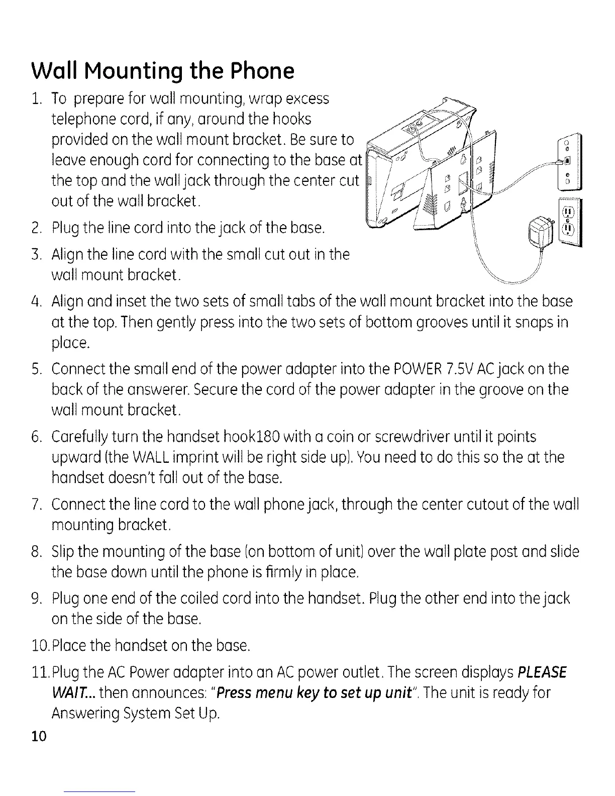 7. Connectthe linecord to the wallphonejack, through thecenter cutout of thewall