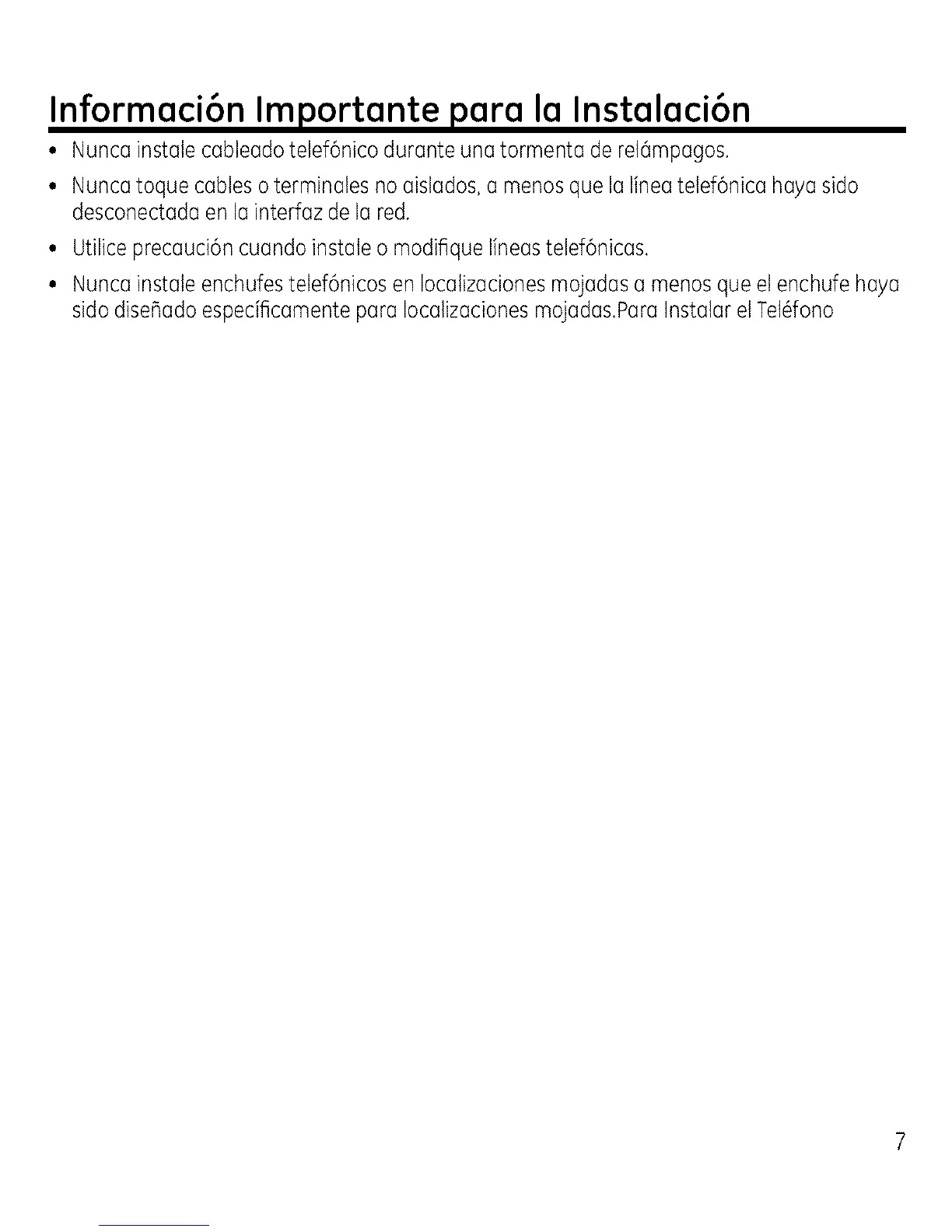 • Nuncainstale cableadotetef6nicodurante unatormenta deret6mpagos.