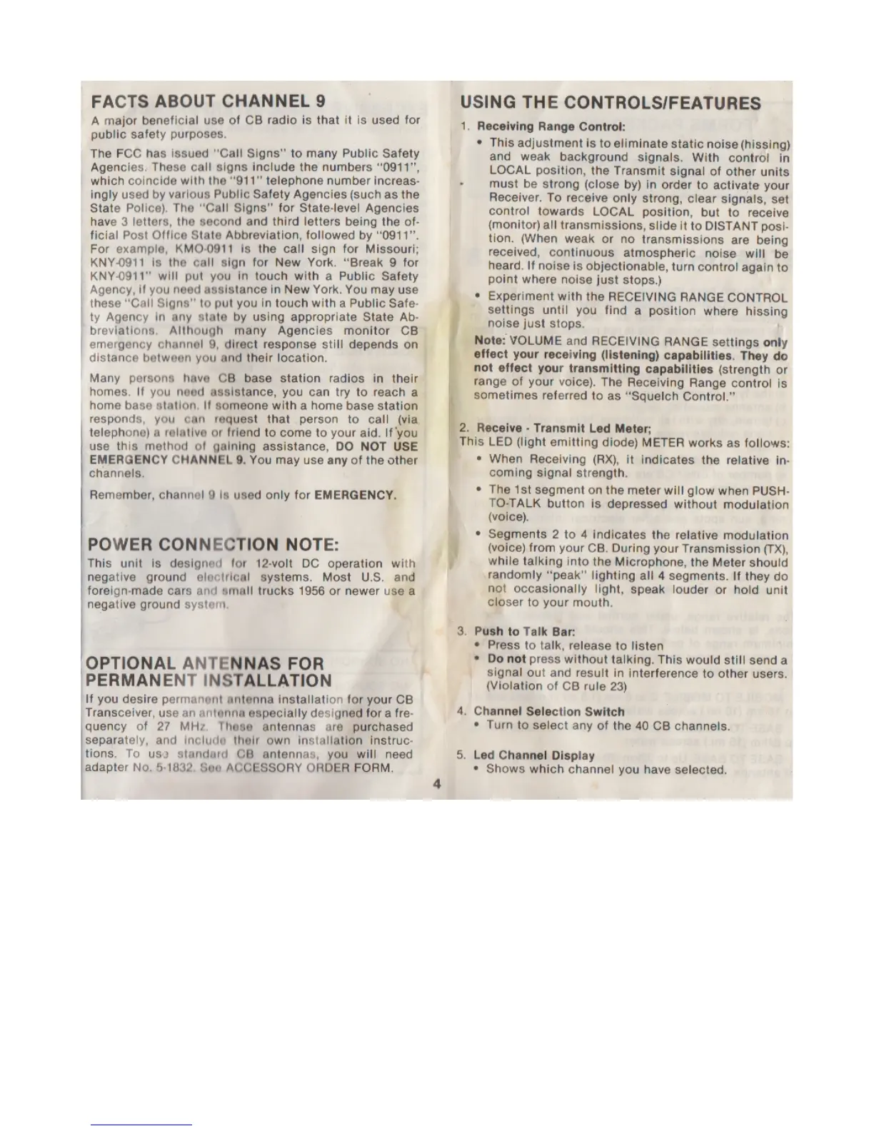 GE 3-5900 - Facts About Channel 9 and Usage; Channel 9 Usage for Emergencies; Power Connection; Using CB Controls and Features