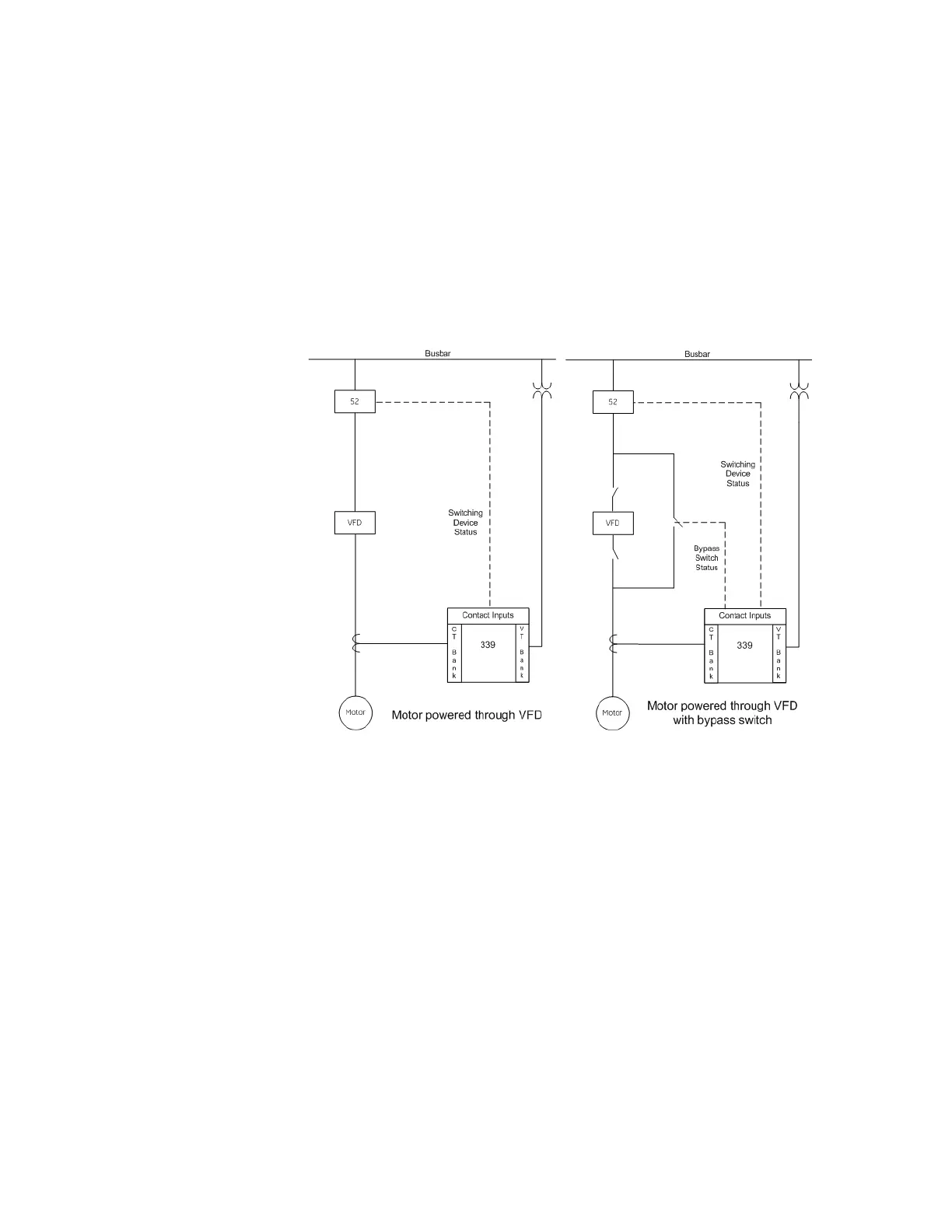 Figure 6-13: Typical VFD motor applications with and without a bypass switch