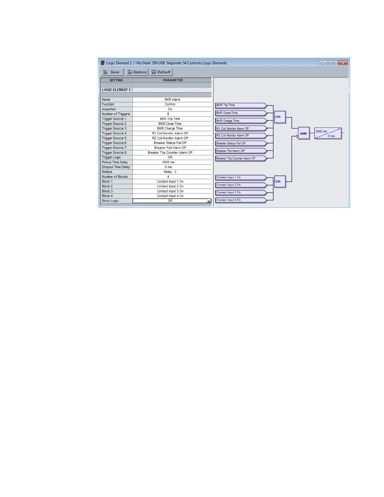 Breaker Alarm. With pickup time delay set to 2000ms, Logic Element 1 (BKR Alarm)