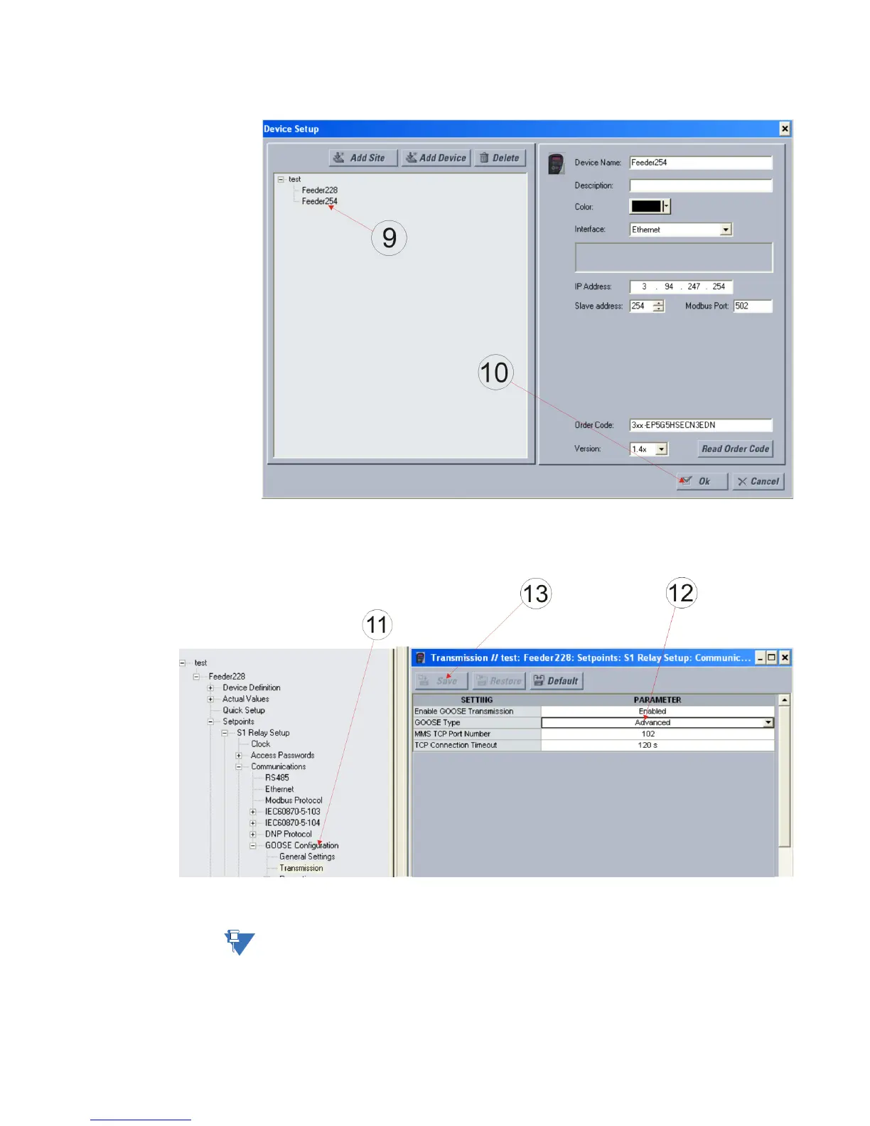 1.11. For relay 228, open Setpoints > Communications > GOOSE Configuration >