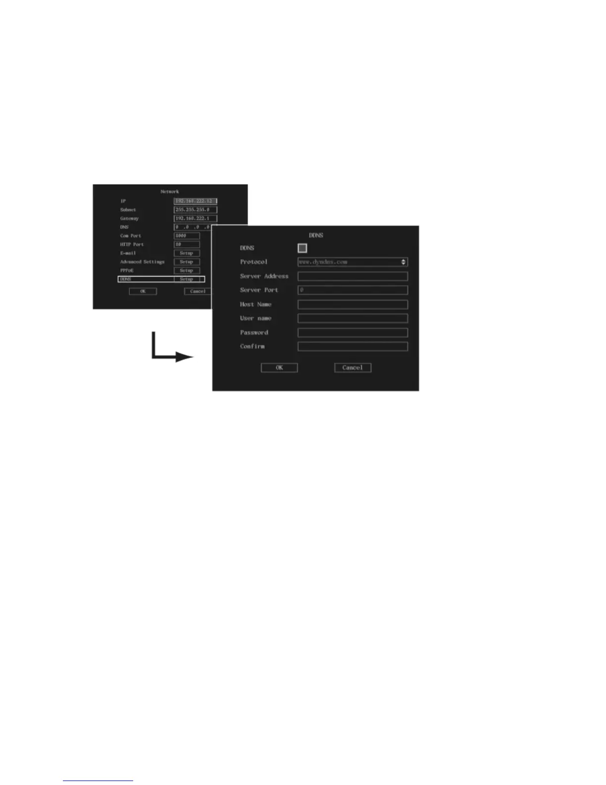 1. In the Network menu go to the DDNS edit box and press the joystick for Enter, or left-click the