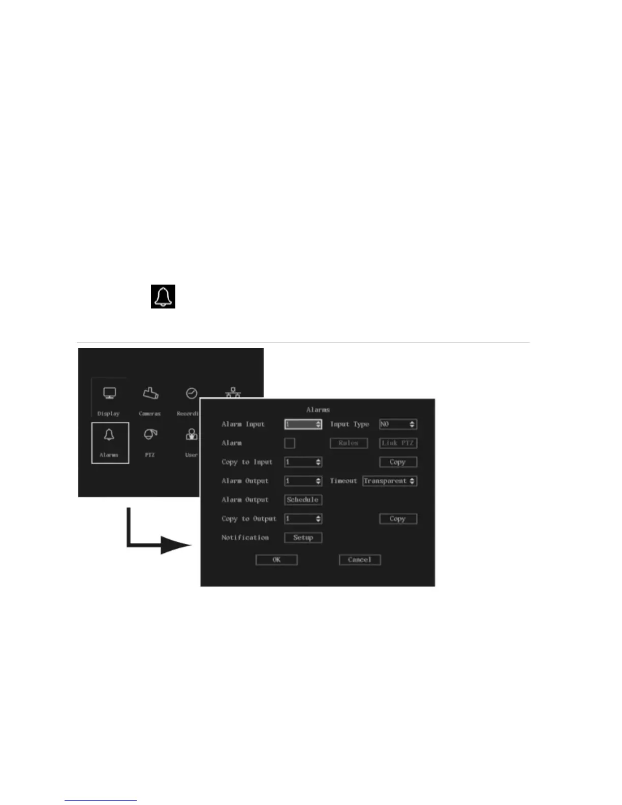 Use the Alarms menu to setup how the TVR 40 responds when an alarm is triggered. You can select