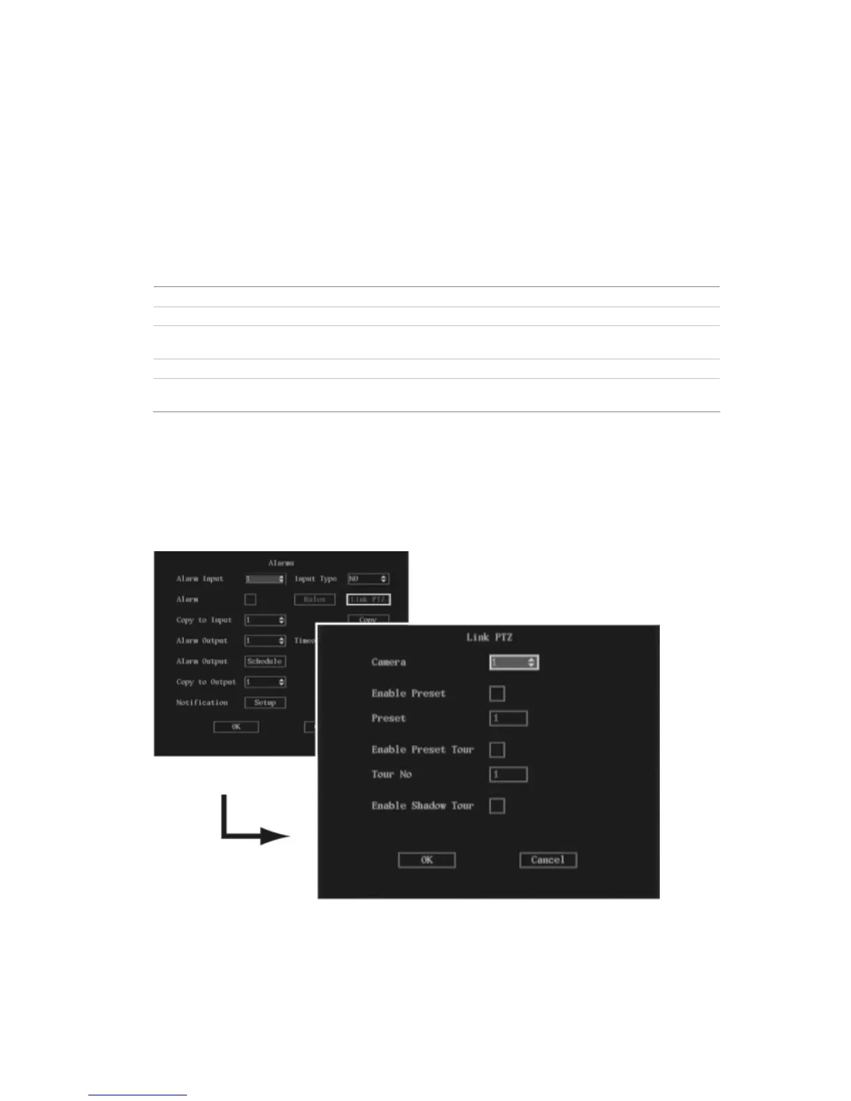 a. In the Alarms menu go to the Link PTZ setup button and press Enter or left-click the mouse.