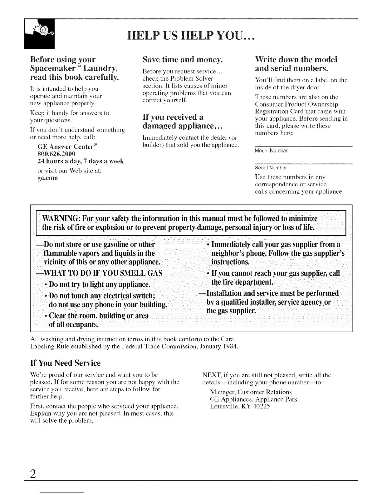 calls concerning your appliance.