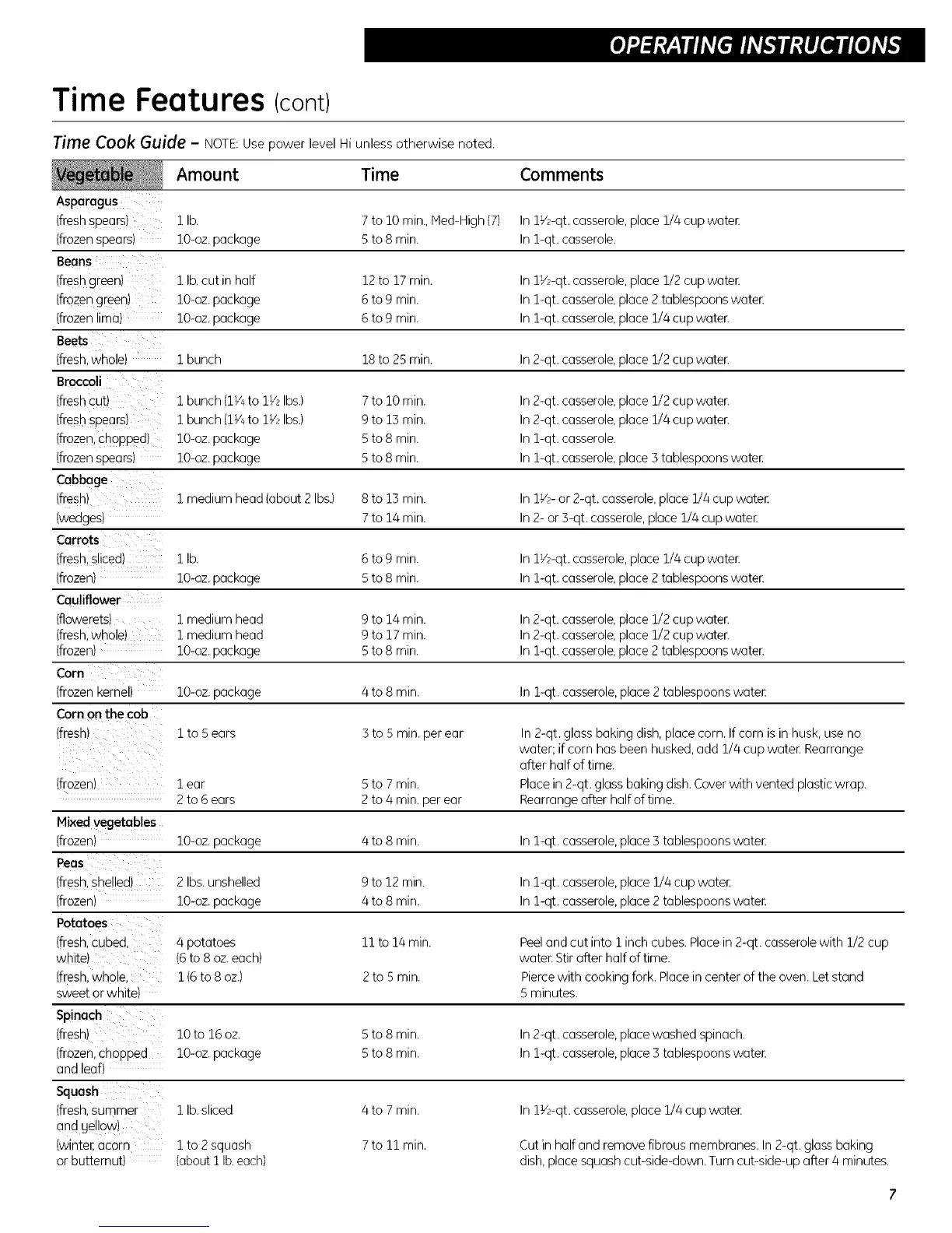 (freshspears) 1 lb. 7 to 10rain., Had-High (7) In lY2-qt, casserole,place 1/4 cup water.