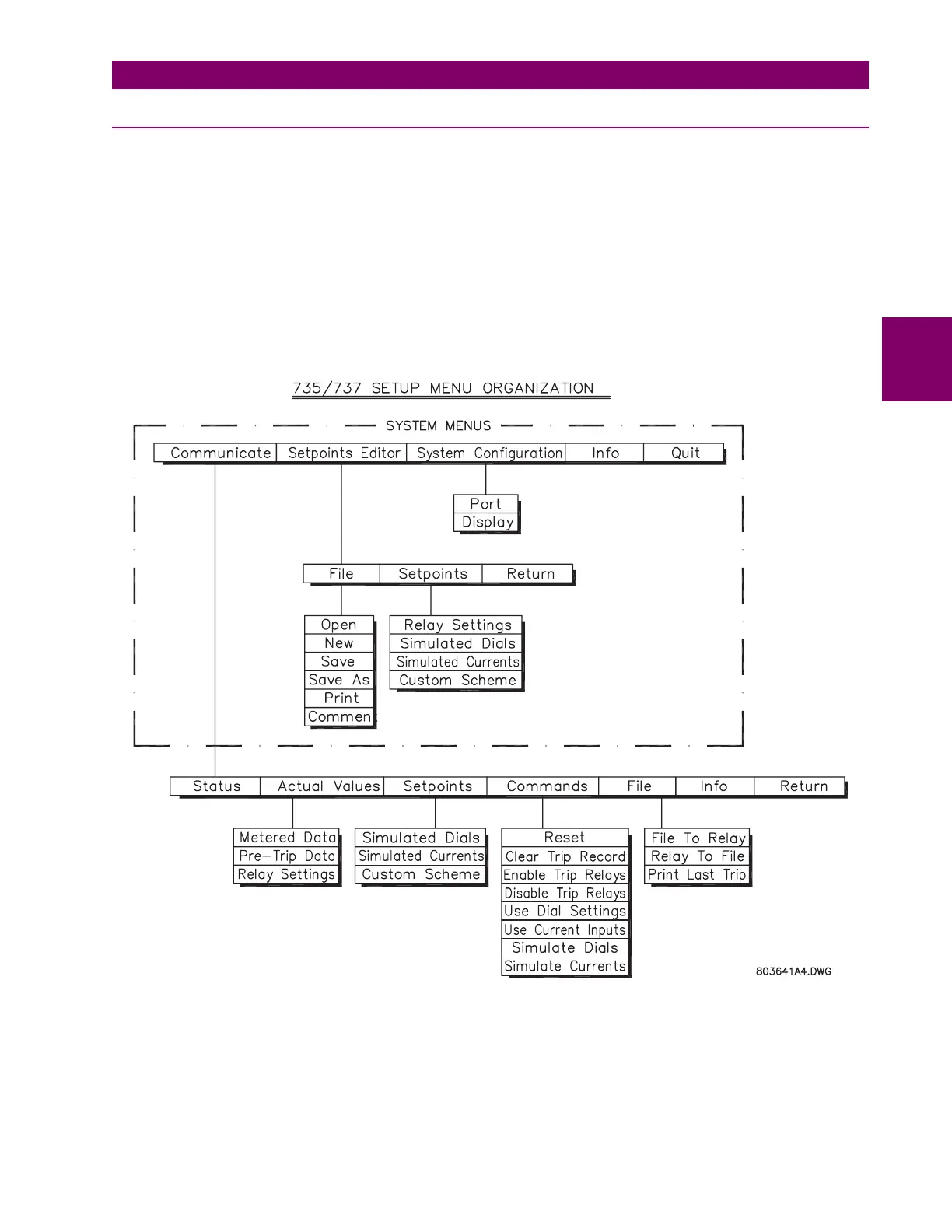 The menus outlined below are used to establish communication with the relay, read/save setpoints to a computer file, con-