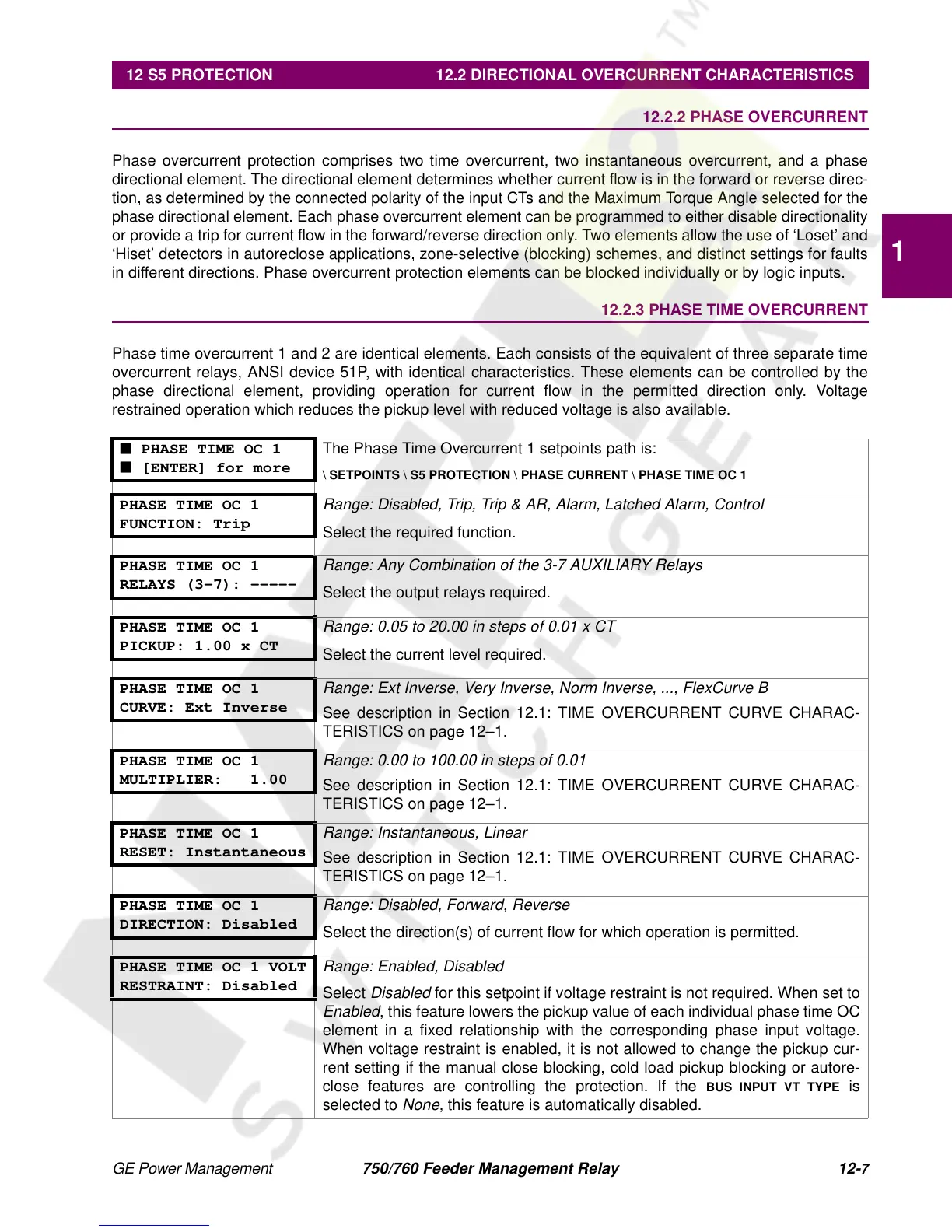 Phase time overcurrent 1 and 2 are identical elements. Each consists of the equivalent of three separate time
