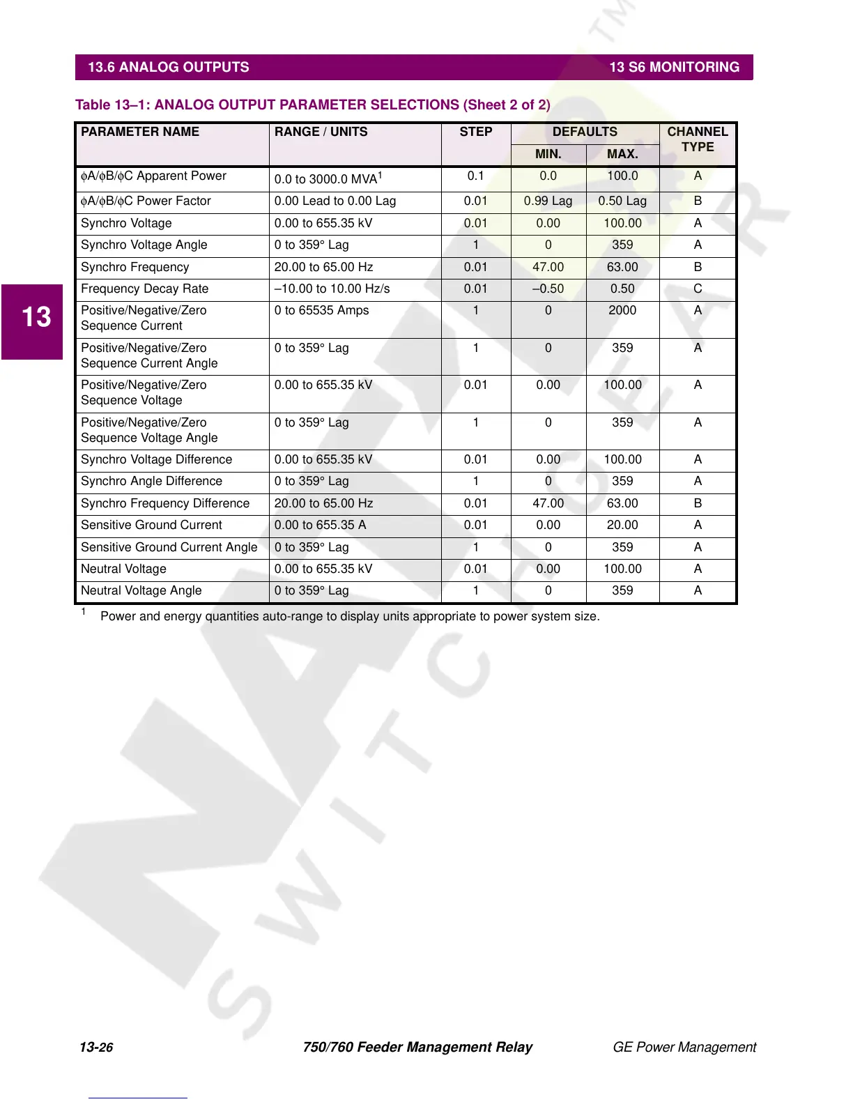 Table 13–1: ANALOG OUTPUT PARAMETER SELECTIONS (Sheet 2 of 2)
