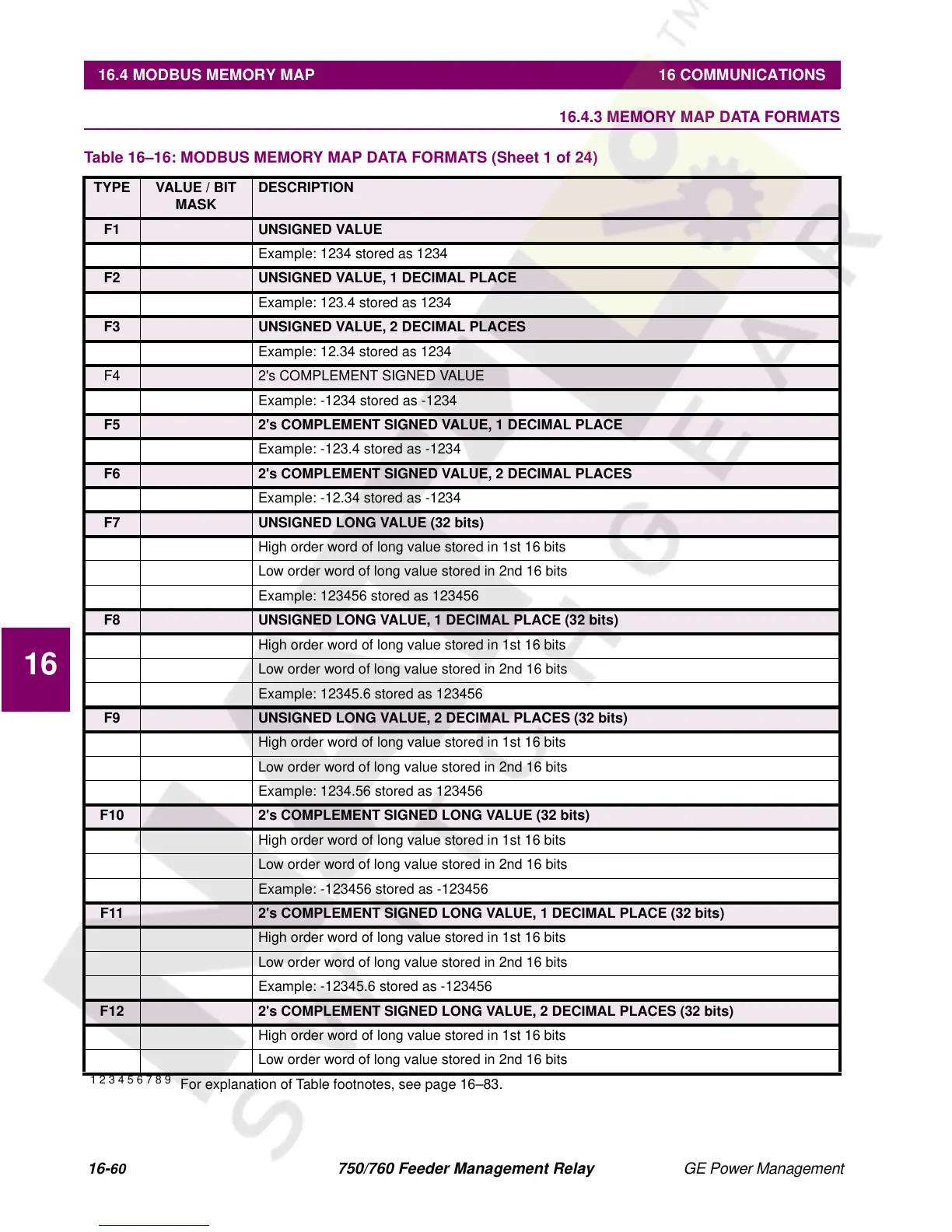 Table 16–16: MODBUS MEMORY MAP DATA FORMATS (Sheet 1 of 24)