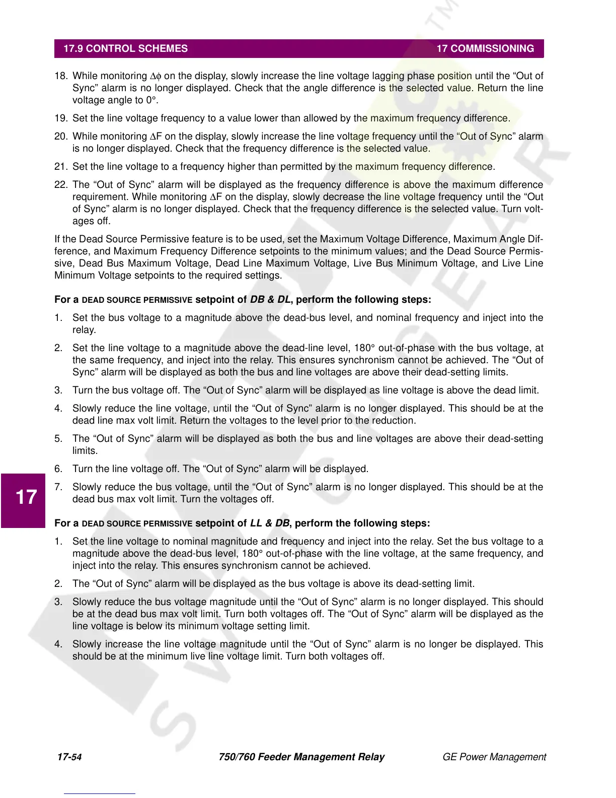 be at the dead bus max volt limit. Turn both voltages off. The “Out of Sync” alarm will be displayed as the
