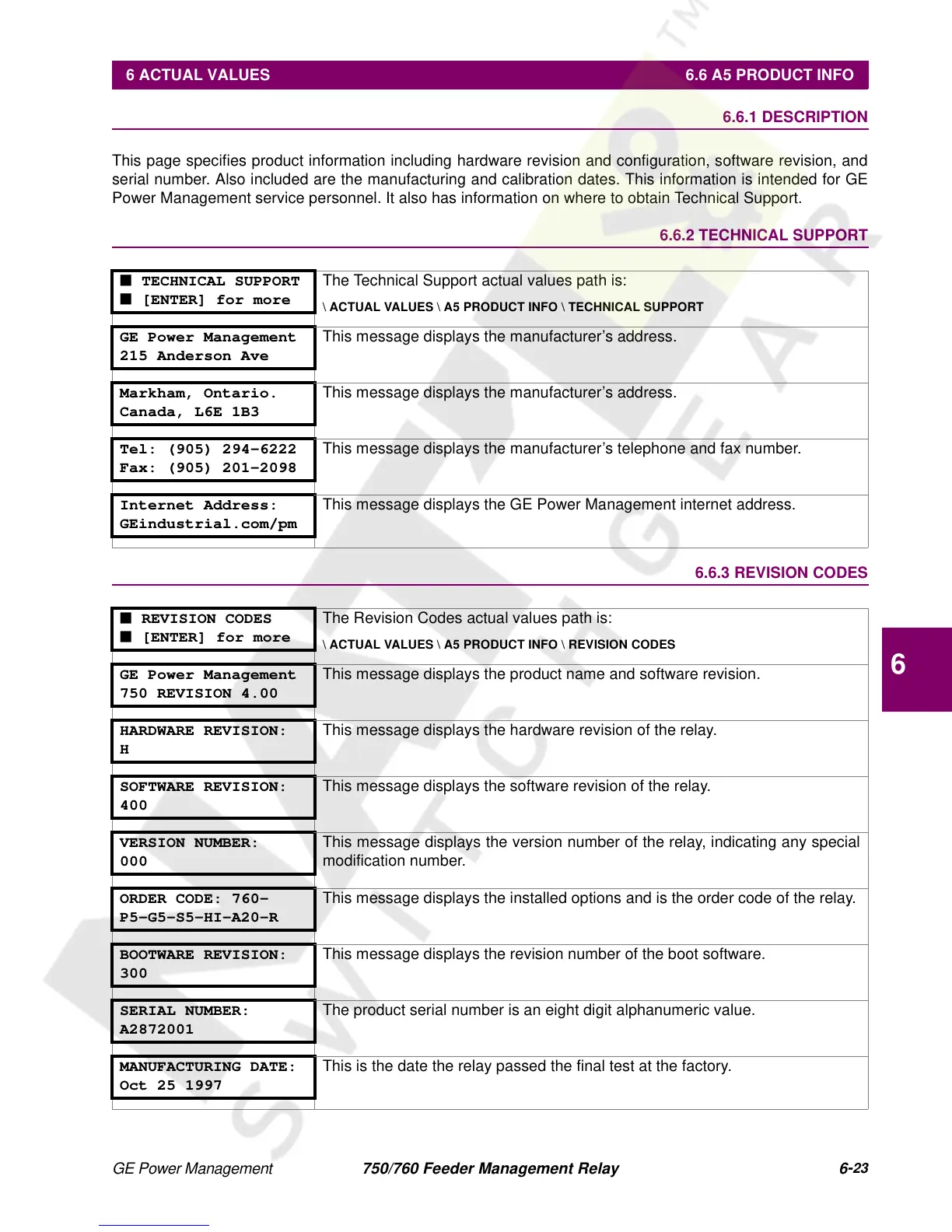 6 ACTUAL VALUES 6.6 A5 PRODUCT INFO