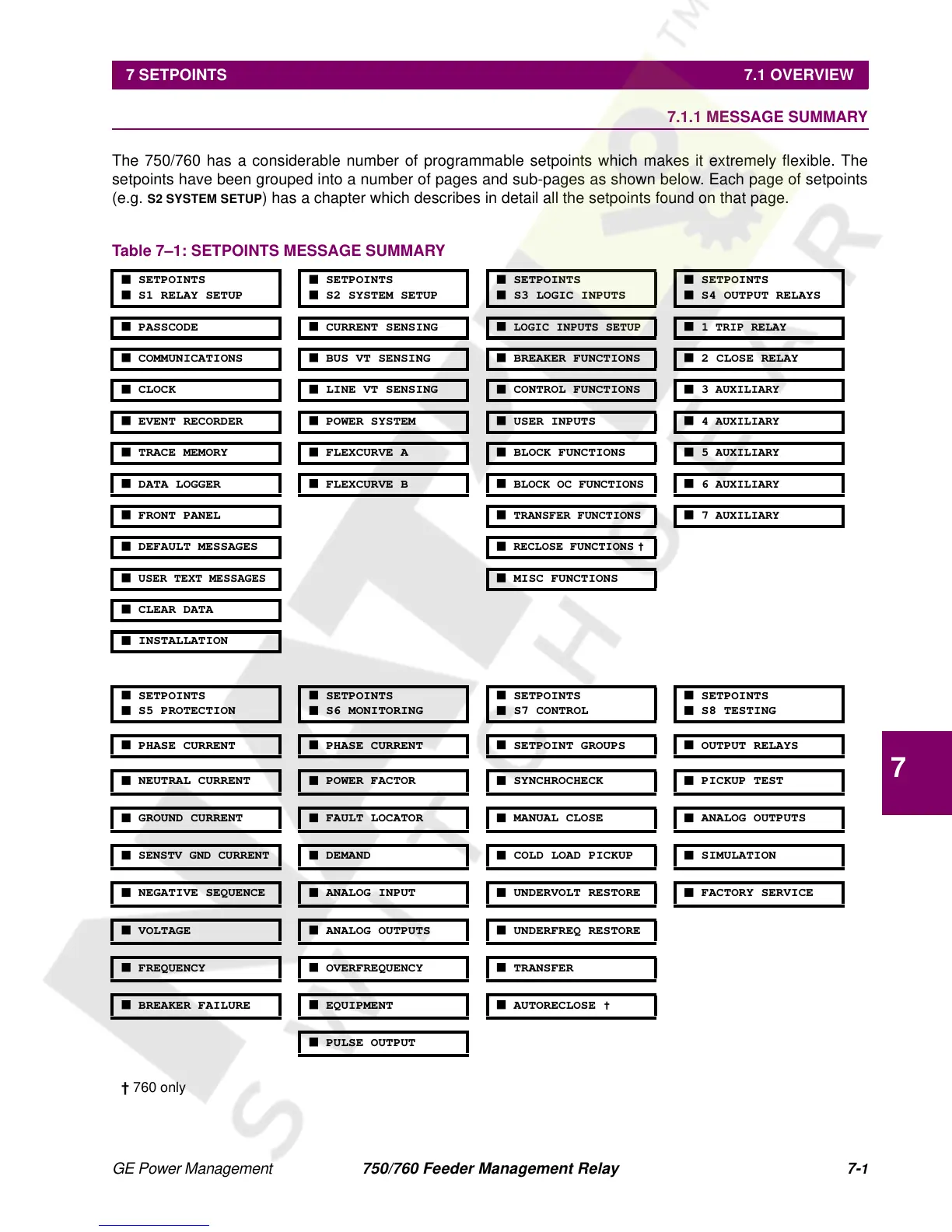 7 SETPOINTS 7.1 OVERVIEW 7.1.1 MESSAGE SUMMARY