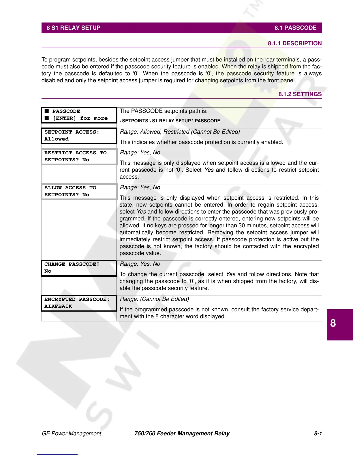 8 S1 RELAY SETUP 8.1 PASSCODE 8.1.1 DESCRIPTION