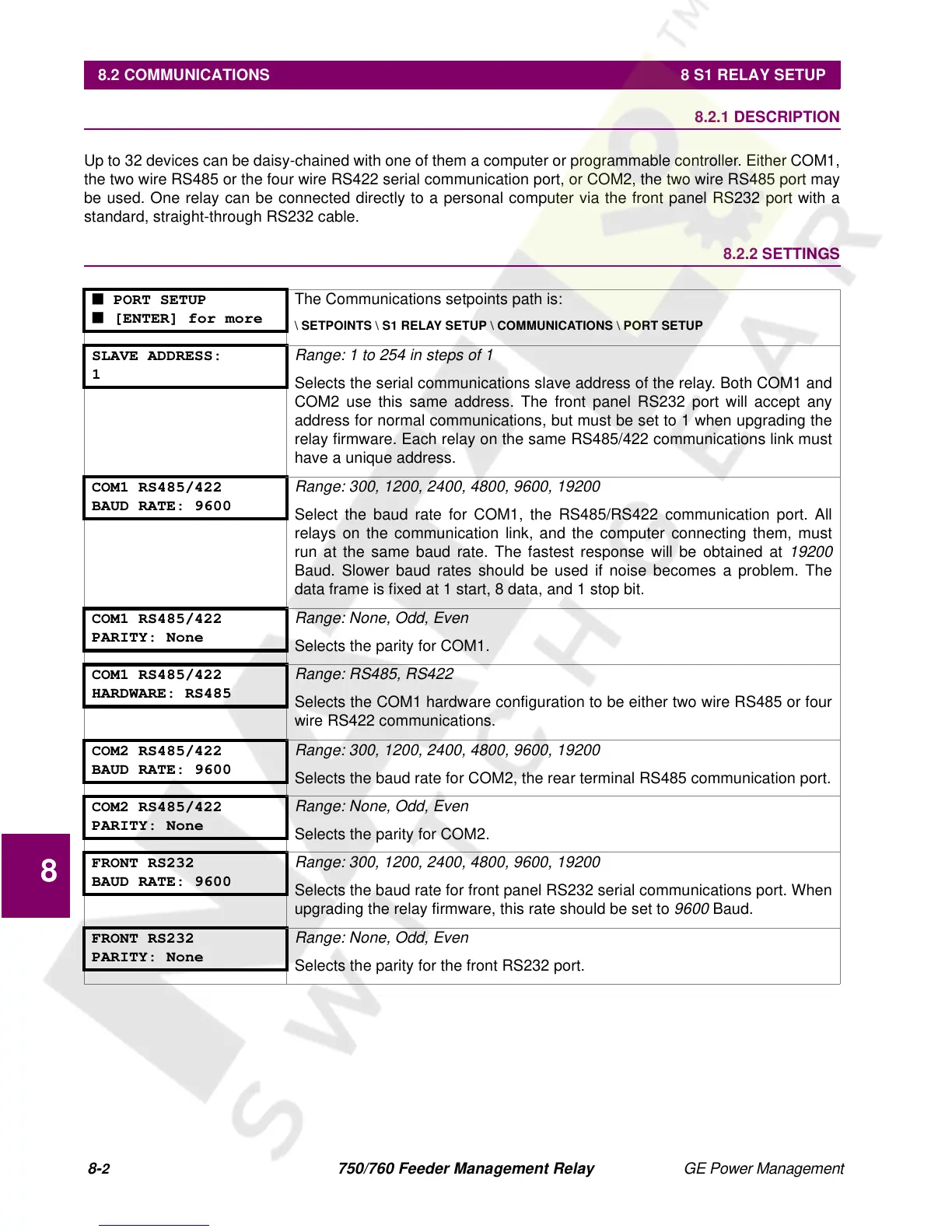 8.2 COMMUNICATIONS 8 S1 RELAY SETUP