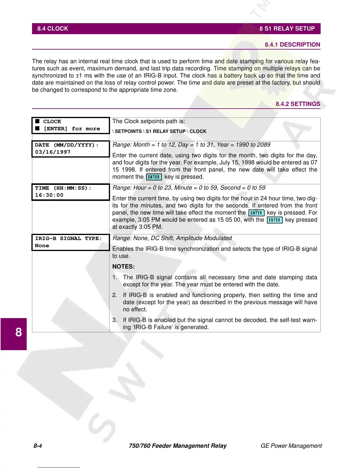 synchronized to ±1 ms with the use of an IRIG-B input. The clock has a battery back up so that the time and