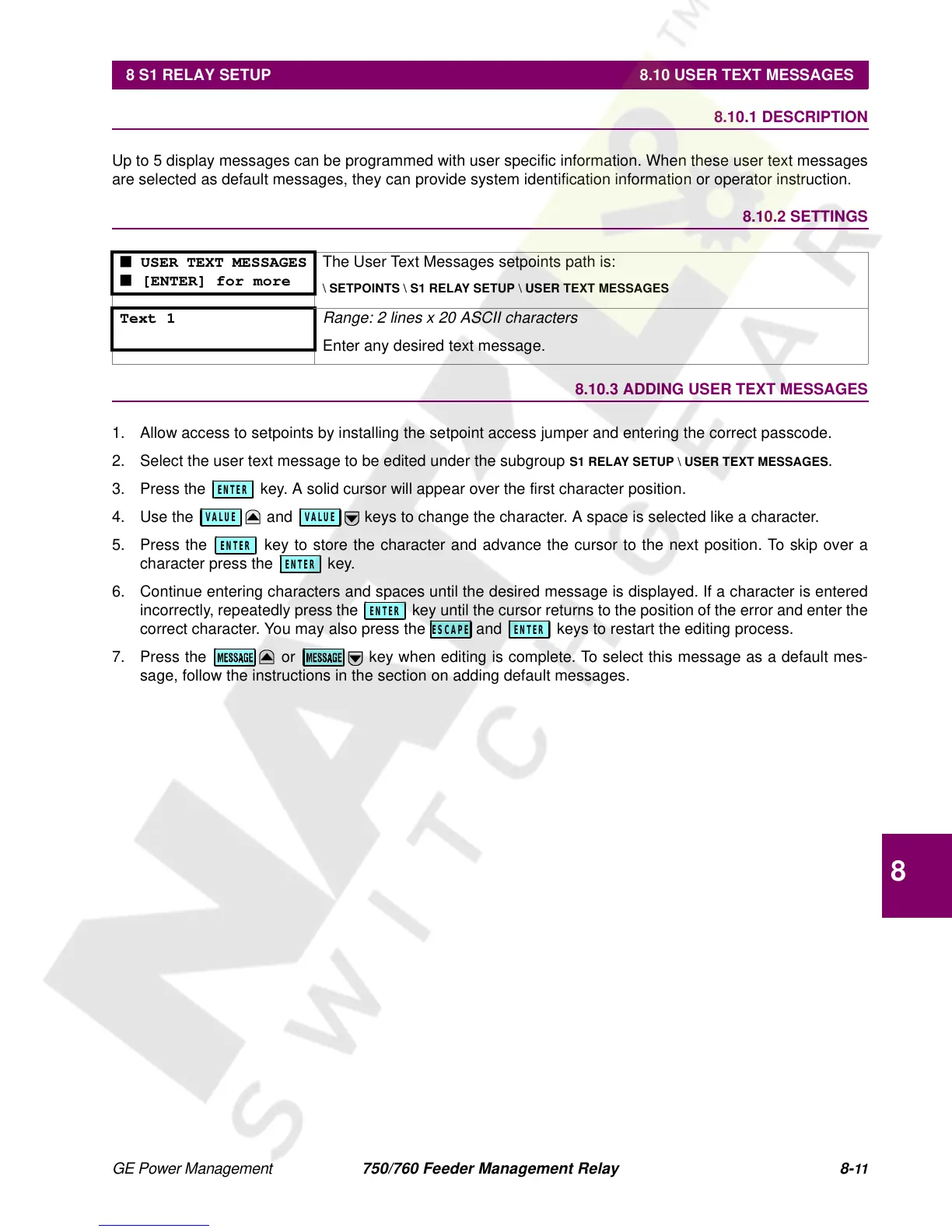 8 S1 RELAY SETUP 8.10 USER TEXT MESSAGES