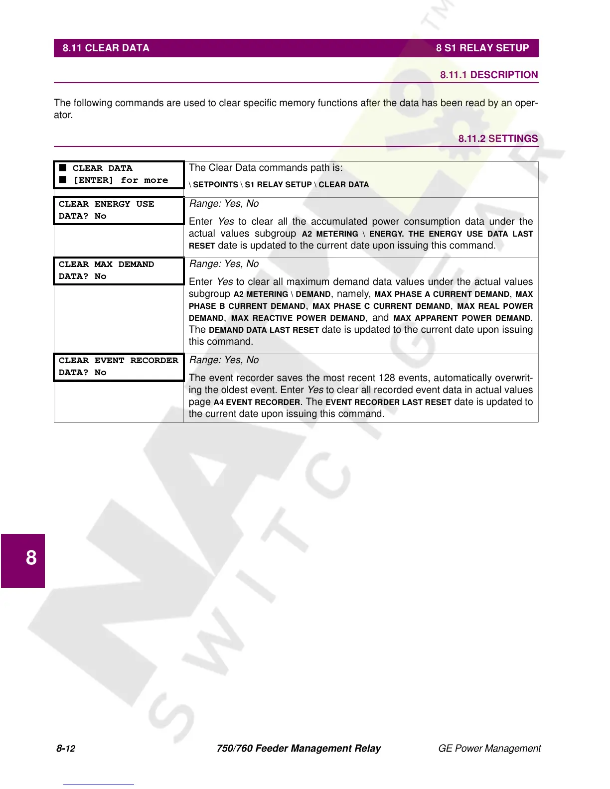 8.11 CLEAR DATA 8 S1 RELAY SETUP