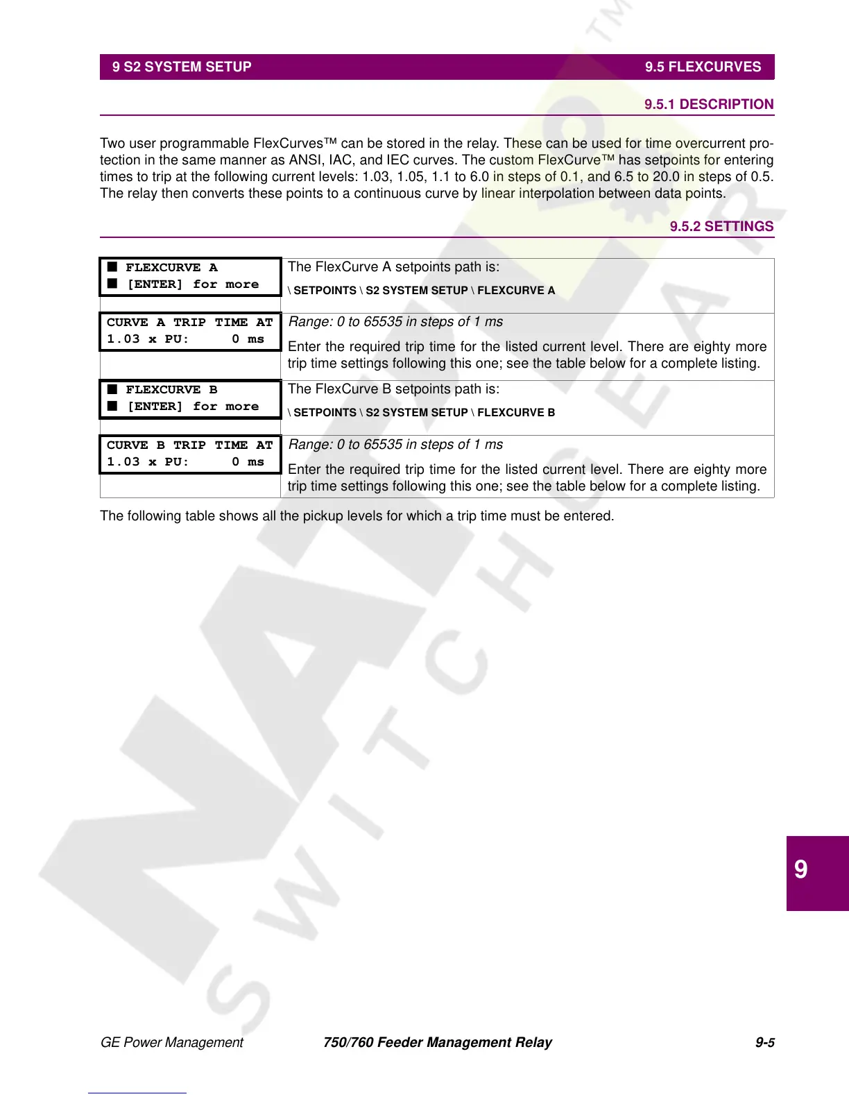 tection in the same manner as ANSI, IAC, and IEC curves. The custom FlexCurve™ has setpoints for entering