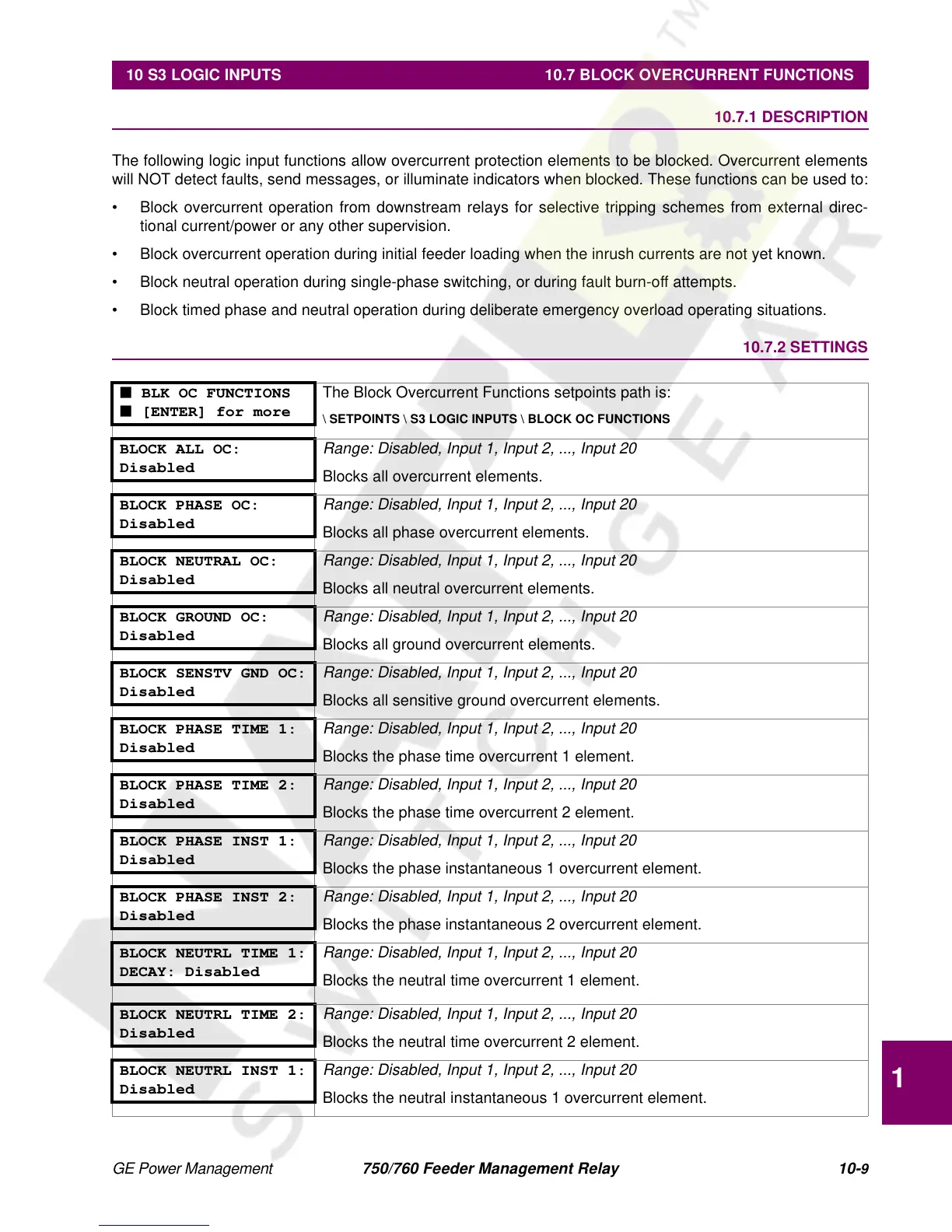 10.7 BLOCK OVERCURRENT FUNCTIONS 10.7.1 DESCRIPTION