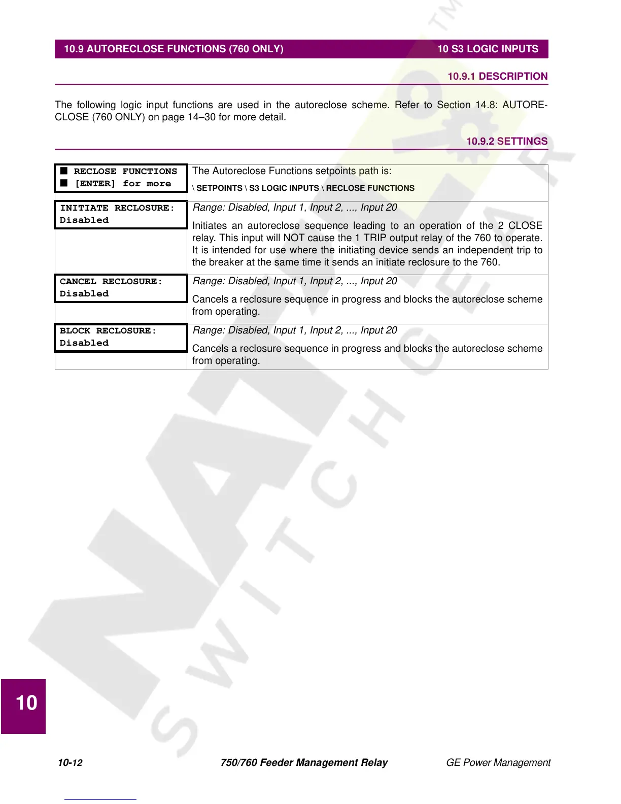 10.9 AUTORECLOSE FUNCTIONS (760 ONLY) 10 S3 LOGIC INPUTS