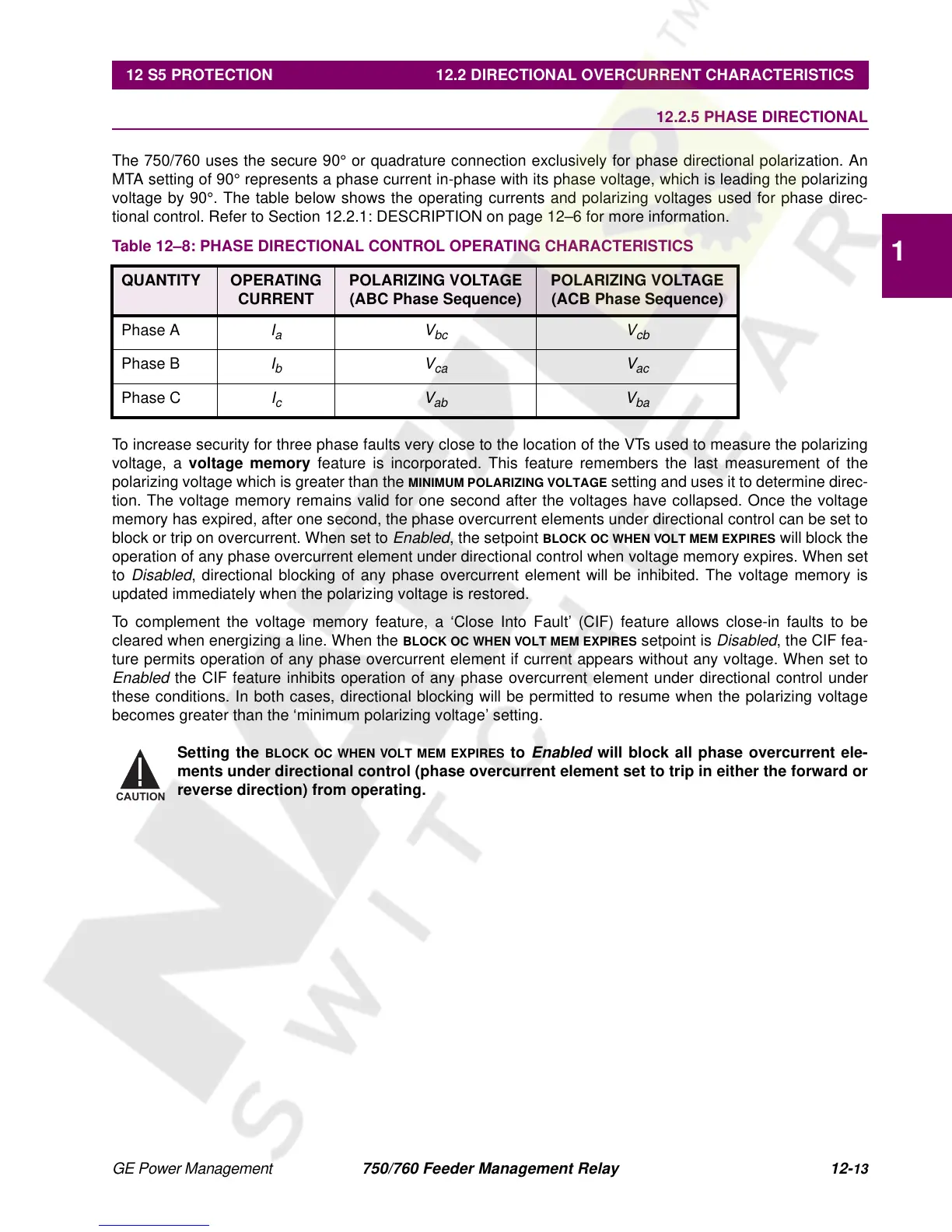 Table 12–8: PHASE DIRECTIONAL CONTROL OPERATING CHARACTERISTICS