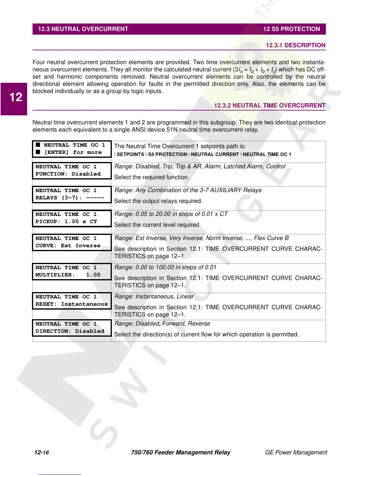 12.3 NEUTRAL OVERCURRENT 12.3.1 DESCRIPTION