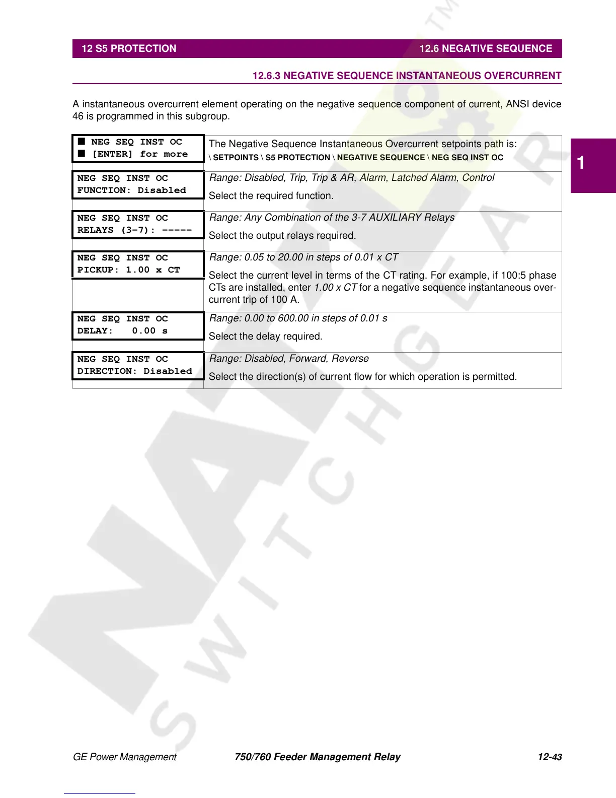 12.6.3 NEGATIVE SEQUENCE INSTANTANEOUS OVERCURRENT