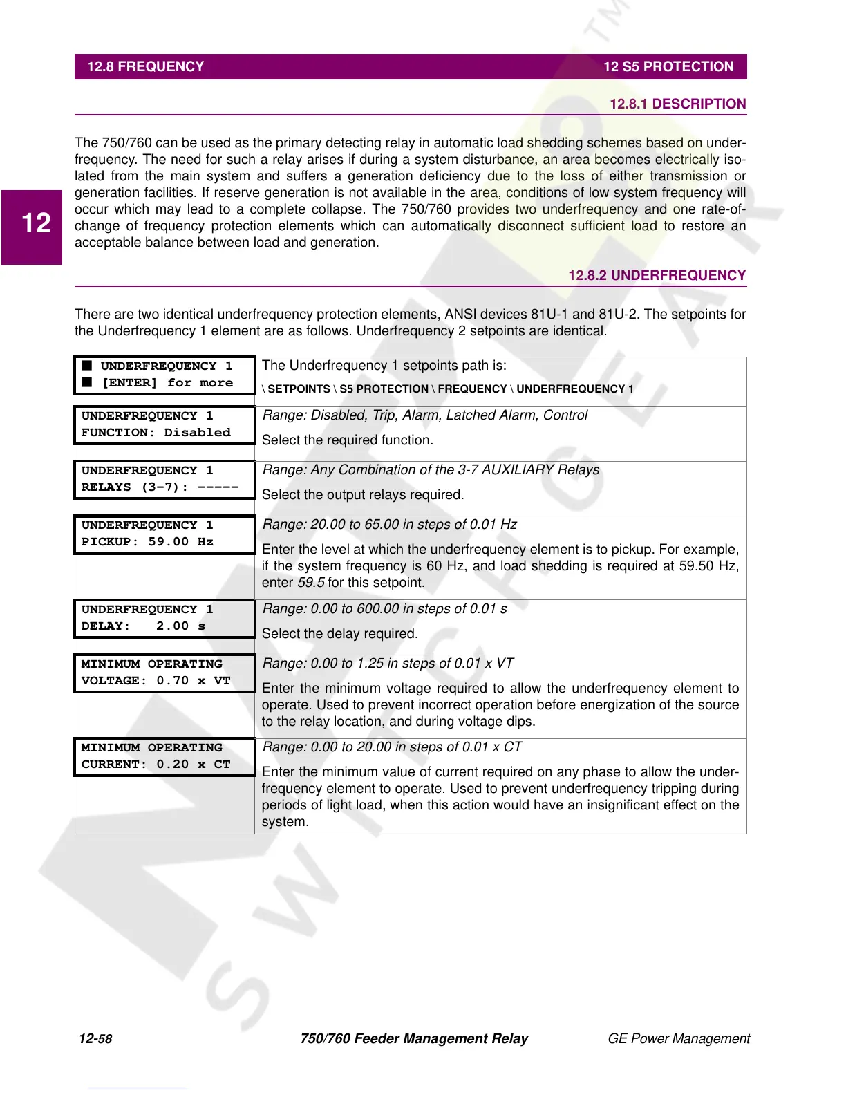 the Underfrequency 1 element are as follows. Underfrequency 2 setpoints are identical.