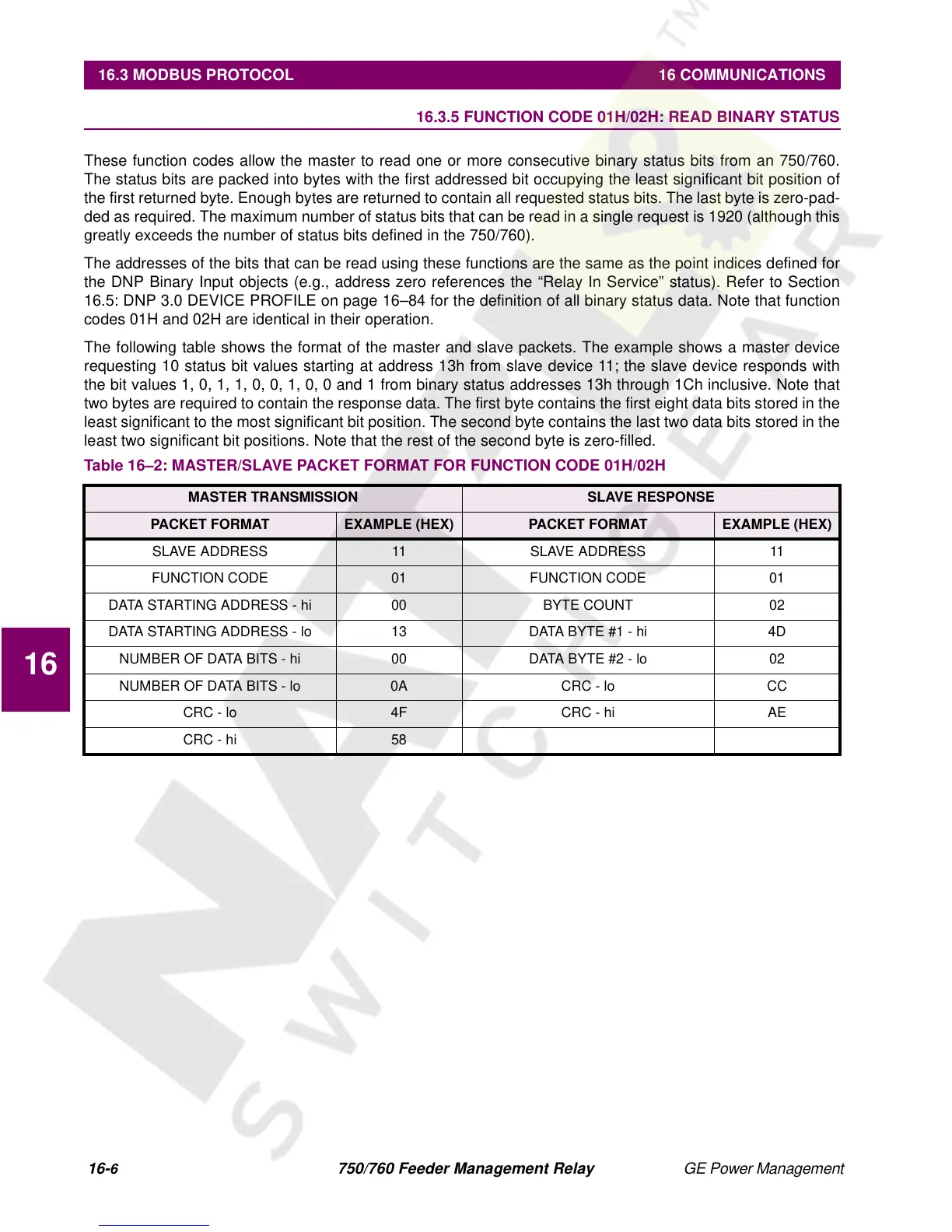 16.3 MODBUS PROTOCOL 16 COMMUNICATIONS