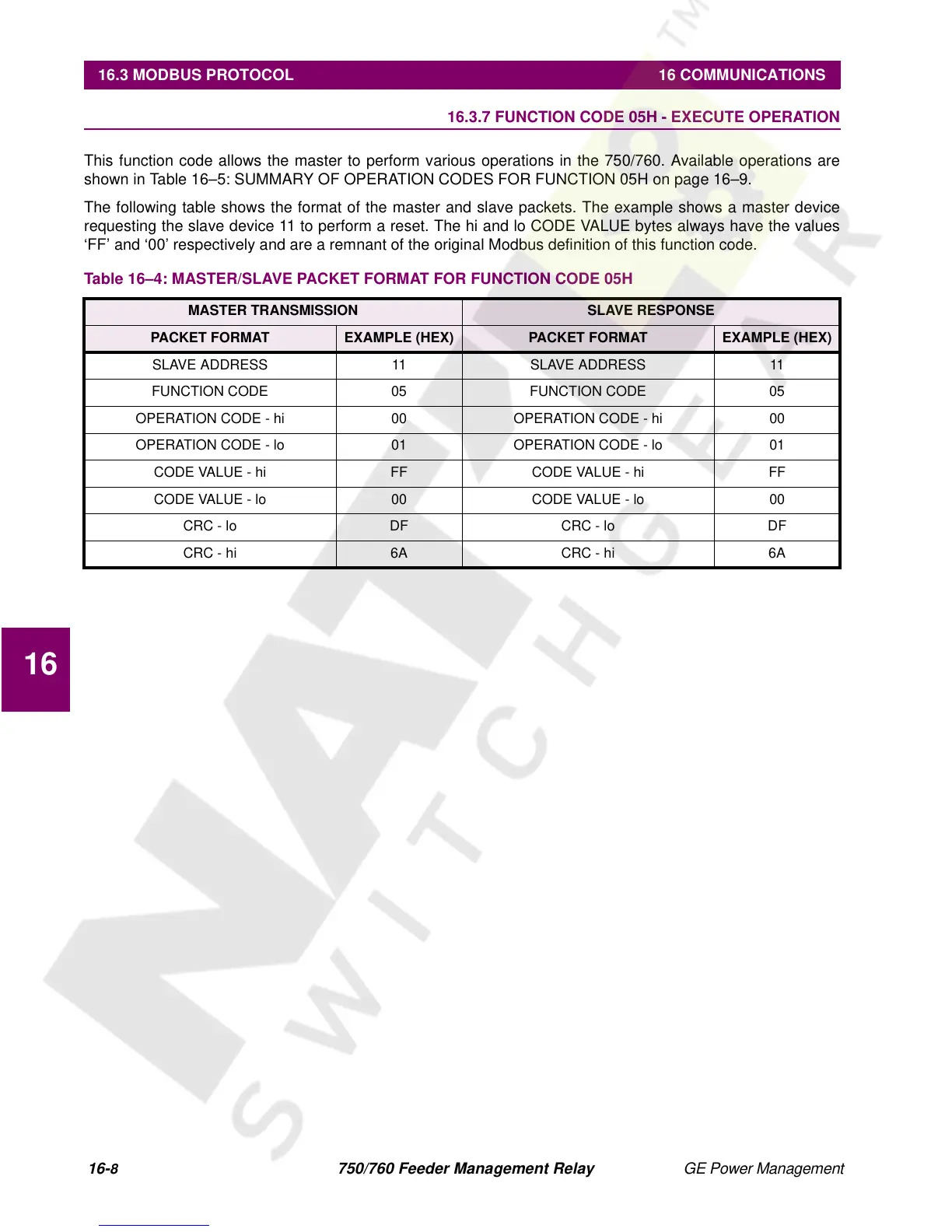 16.3 MODBUS PROTOCOL 16 COMMUNICATIONS