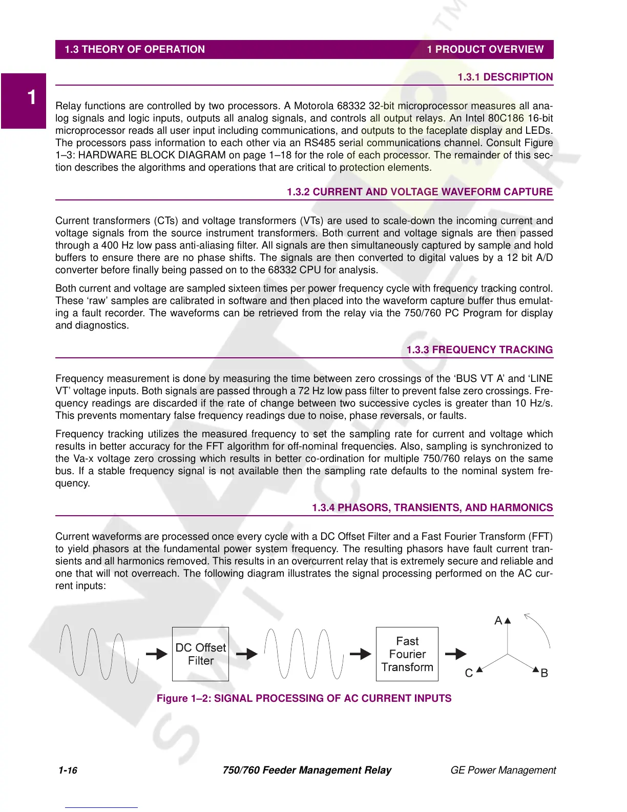 Current waveforms are processed once every cycle with a DC Offset Filter and a Fast Fourier Transform (FFT)