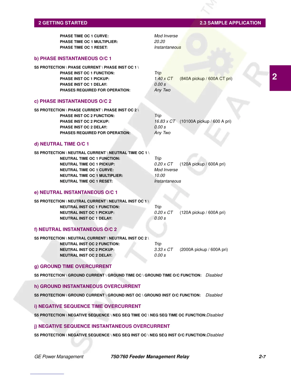j) NEGATIVE SEQUENCE INSTANTANEOUS OVERCURRENT