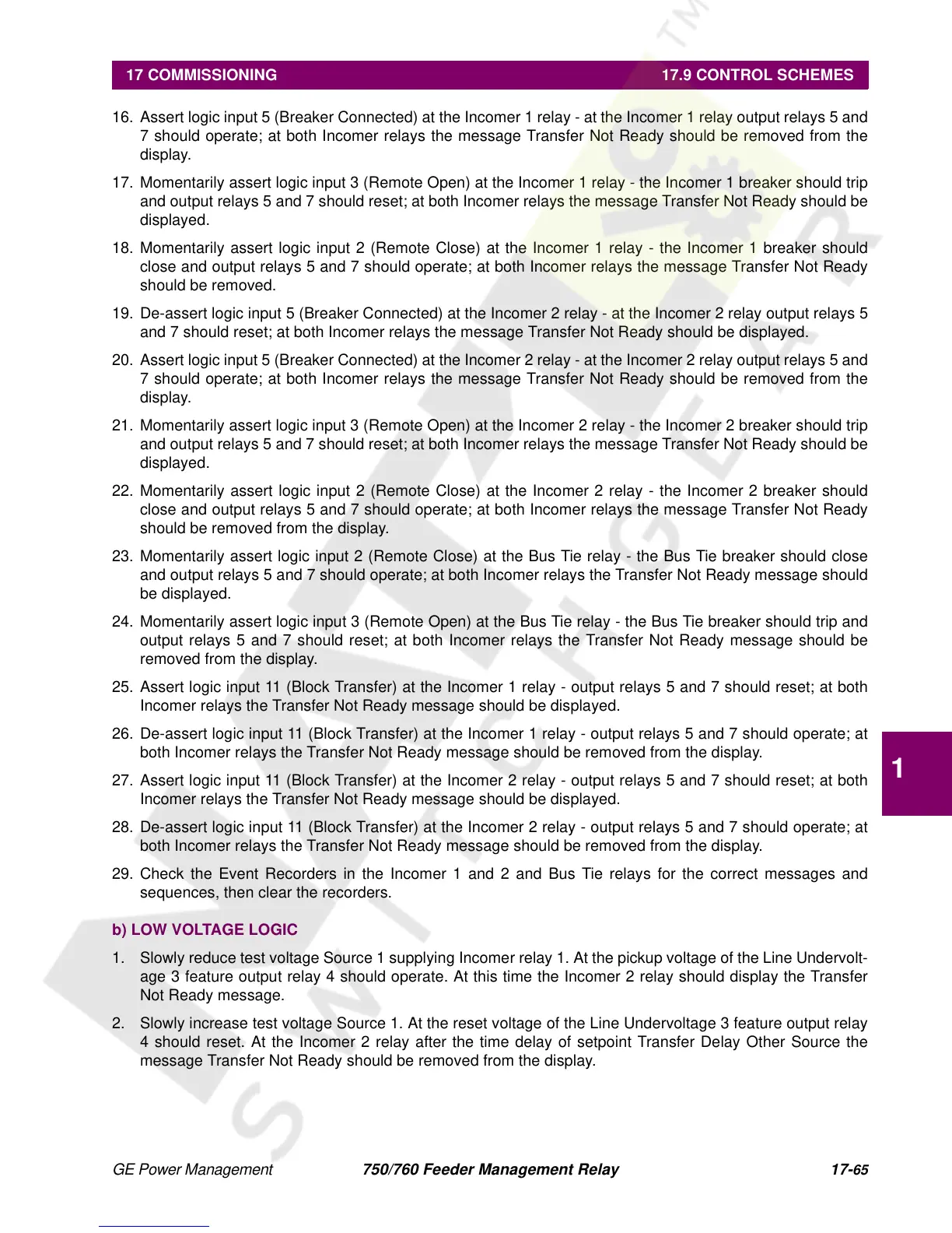 29. Check the Event Recorders in the Incomer 1 and 2 and Bus Tie relays for the correct messages and