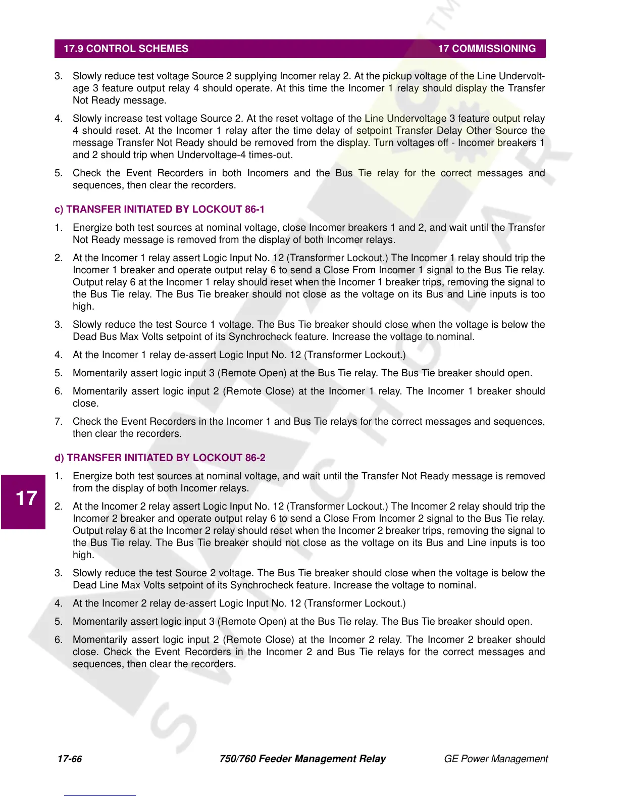 age 3 feature output relay 4 should operate. At this time the Incomer 1 relay should display the Transfer