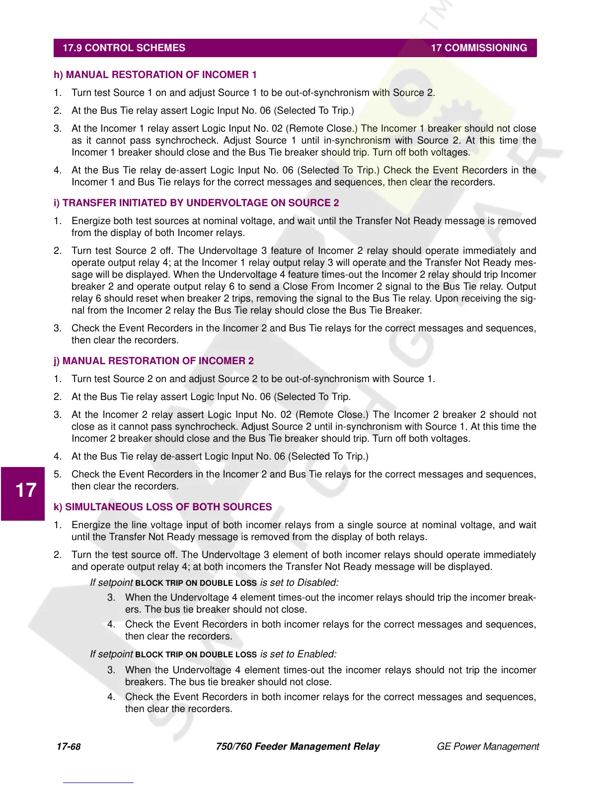 5. Check the Event Recorders in the Incomer 2 and Bus Tie relays for the correct messages and sequences,