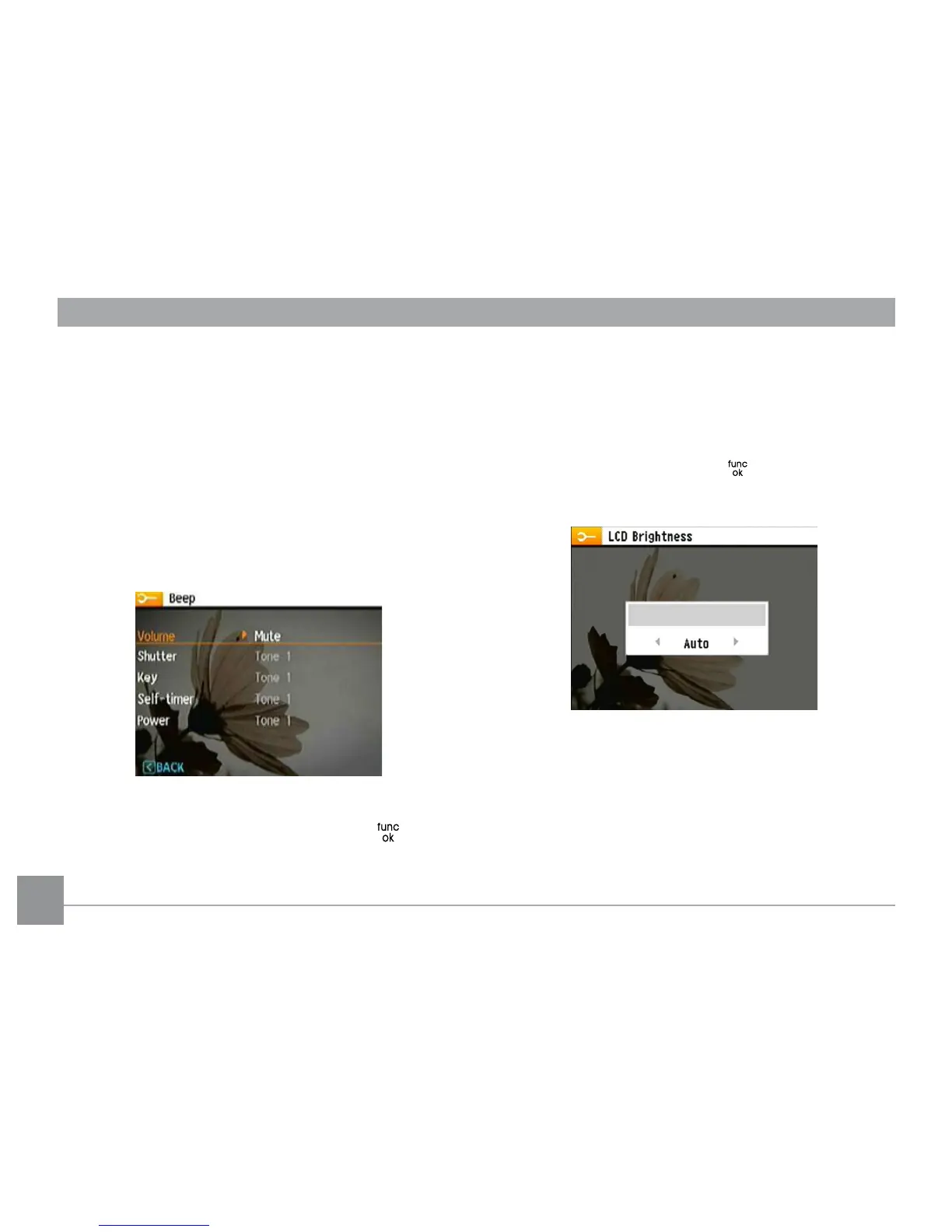 volume, shutter tone, key tone, self-timer tone, and power