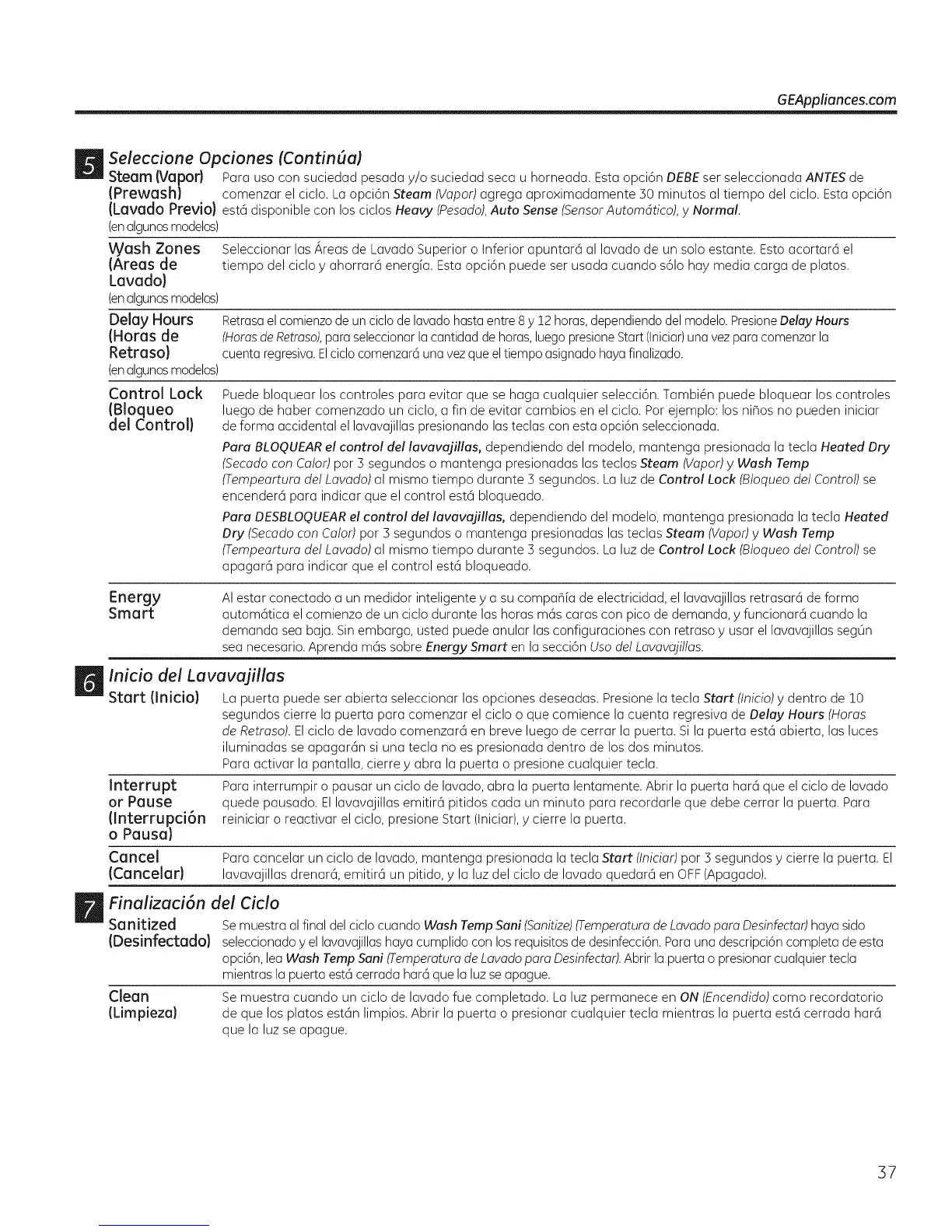 (Prewash} comenzar el ciclo. LGopci6n Steam (Vapor) agrega aproximadamente 30 minutos al tiempo del ciclo. Esta opci6n
