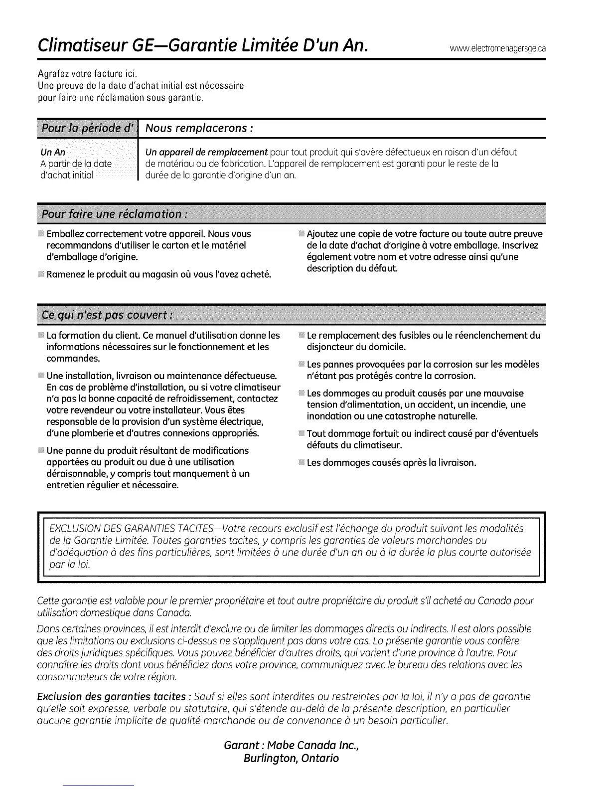 Climatiseur GE--Garantie Limit@e D'un An. www.electromenagersge.ca