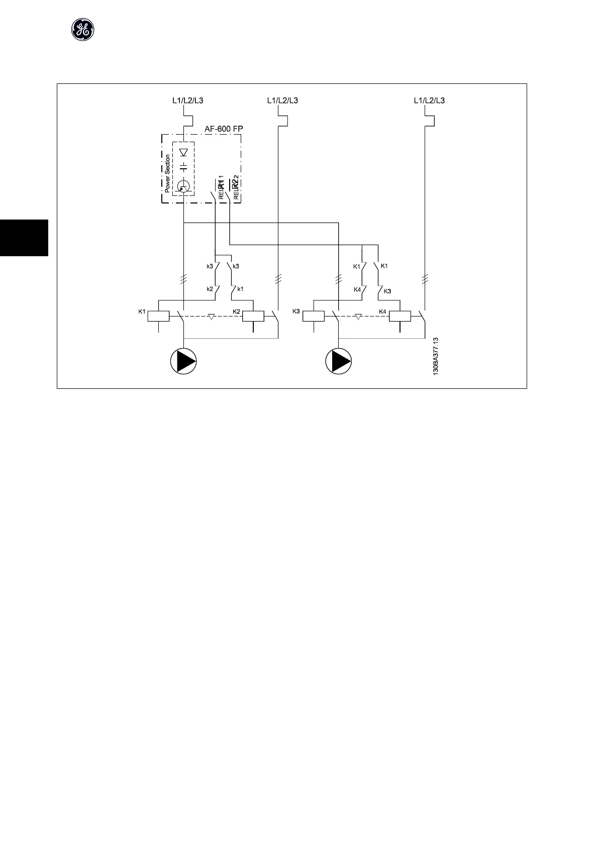 Every pump must be connected to two contactors (K1/K2 and K3/K4) with a mechanical interlock. Thermal relays or other motor protection devices must be