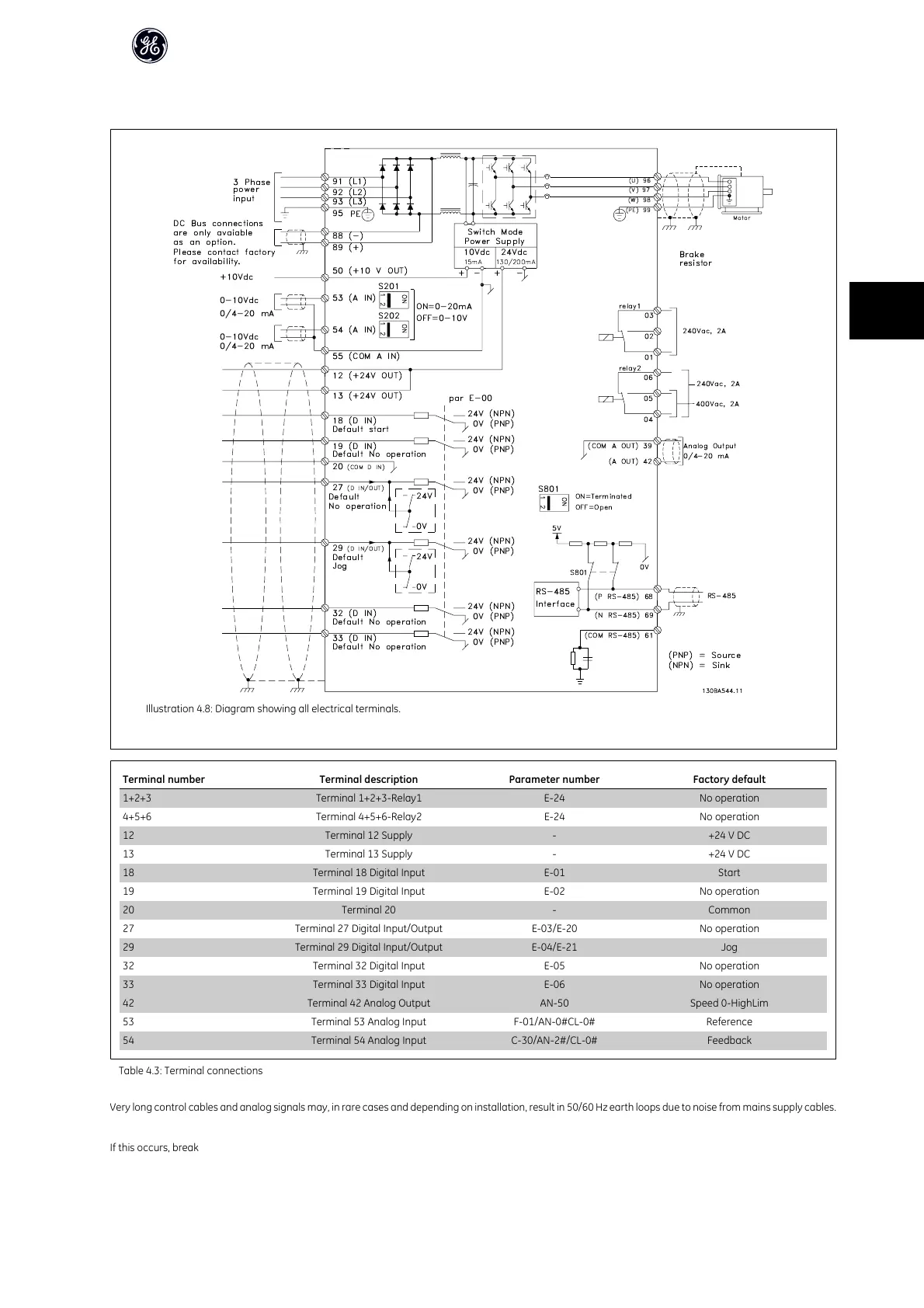 Very long control cables and analog signals may, in rare cases and depending on installation, result in 50/60 Hz earth loops due to noise from mains supply cables.