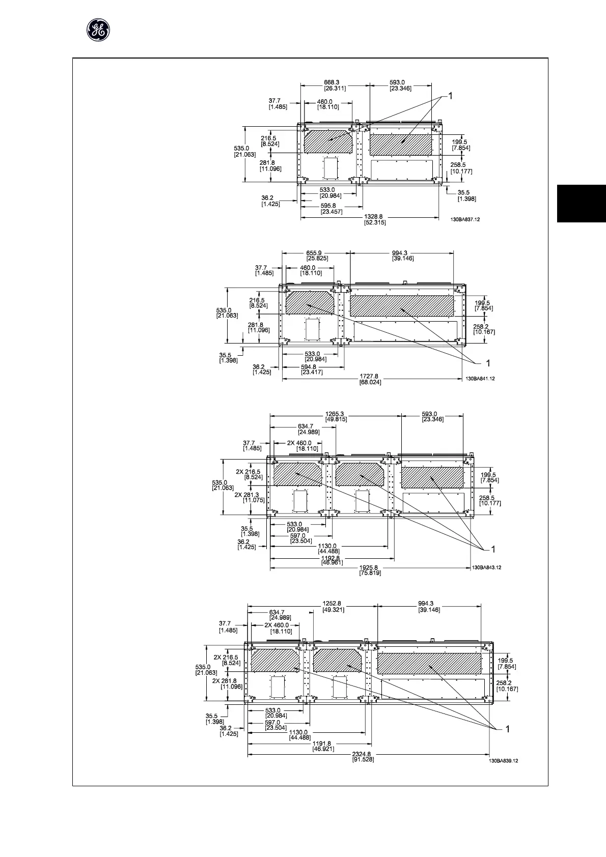 Unit Size 61 to 64: Cable entries viewed from the bottom of the frequency converter - 1) Place conduits in marked areas
