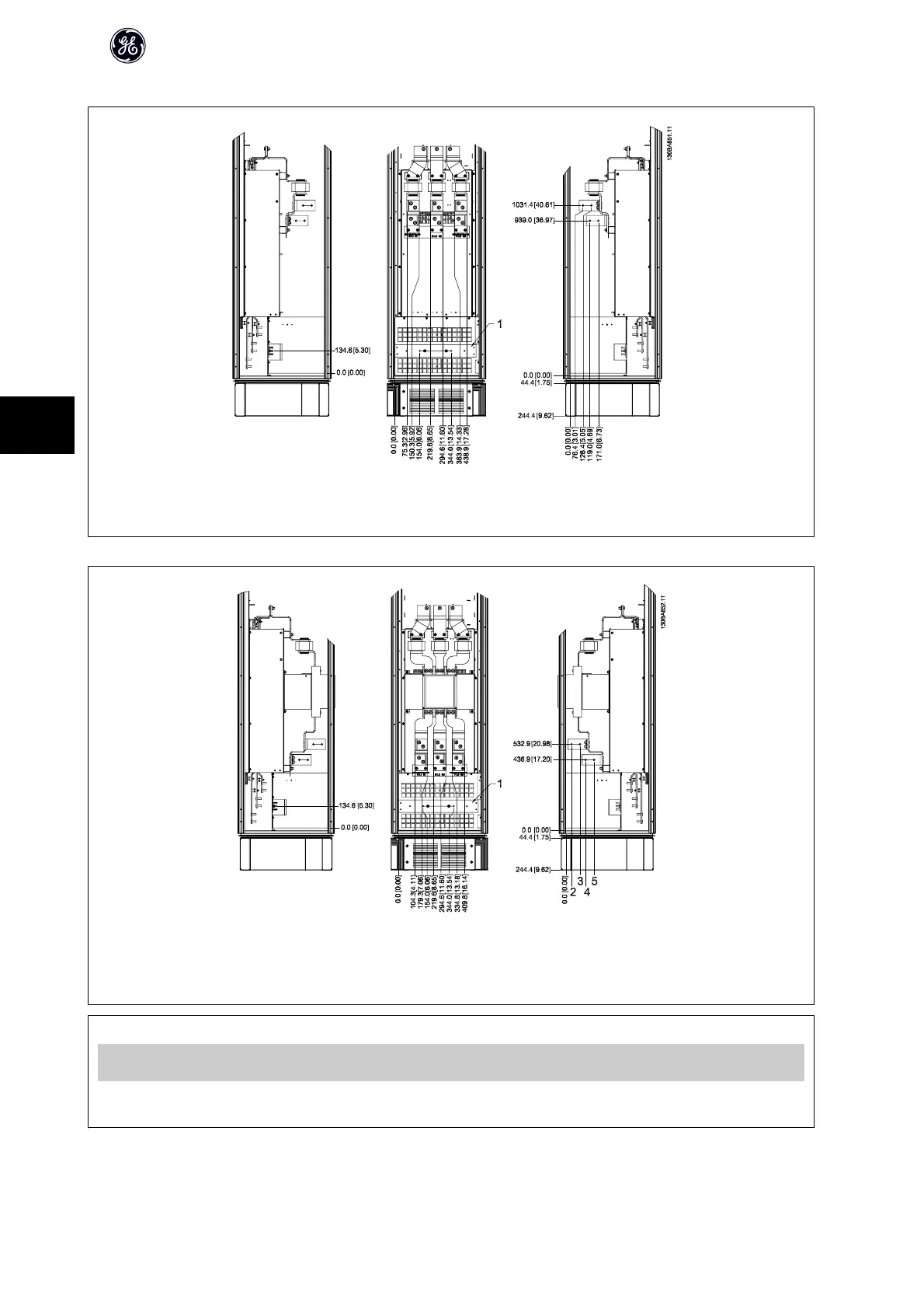 Illustration 6.22: Terminal locations - Options Cabinet (Left side, front and right side view). The gland plate is 42 mm below .0 level.