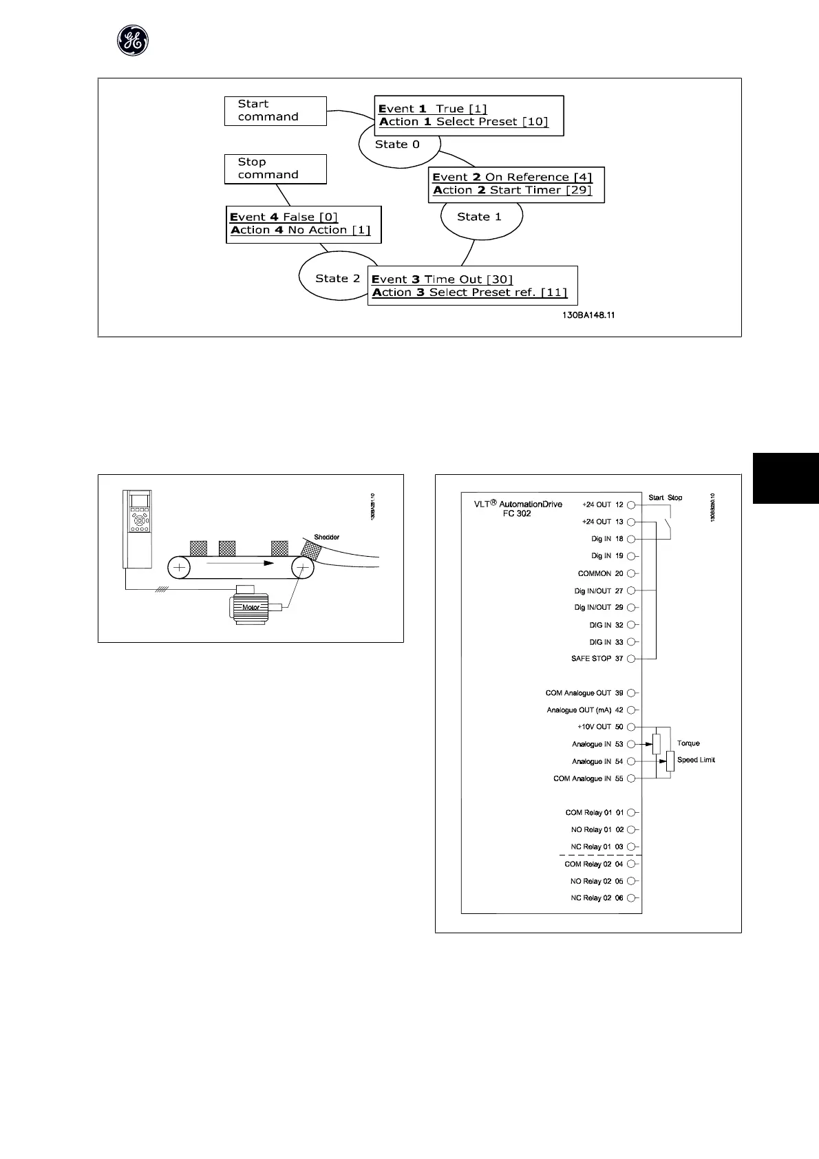 Start / stop command is applied on terminal 18. If stop signal is applied the frequency converter will decel and go into free mode.