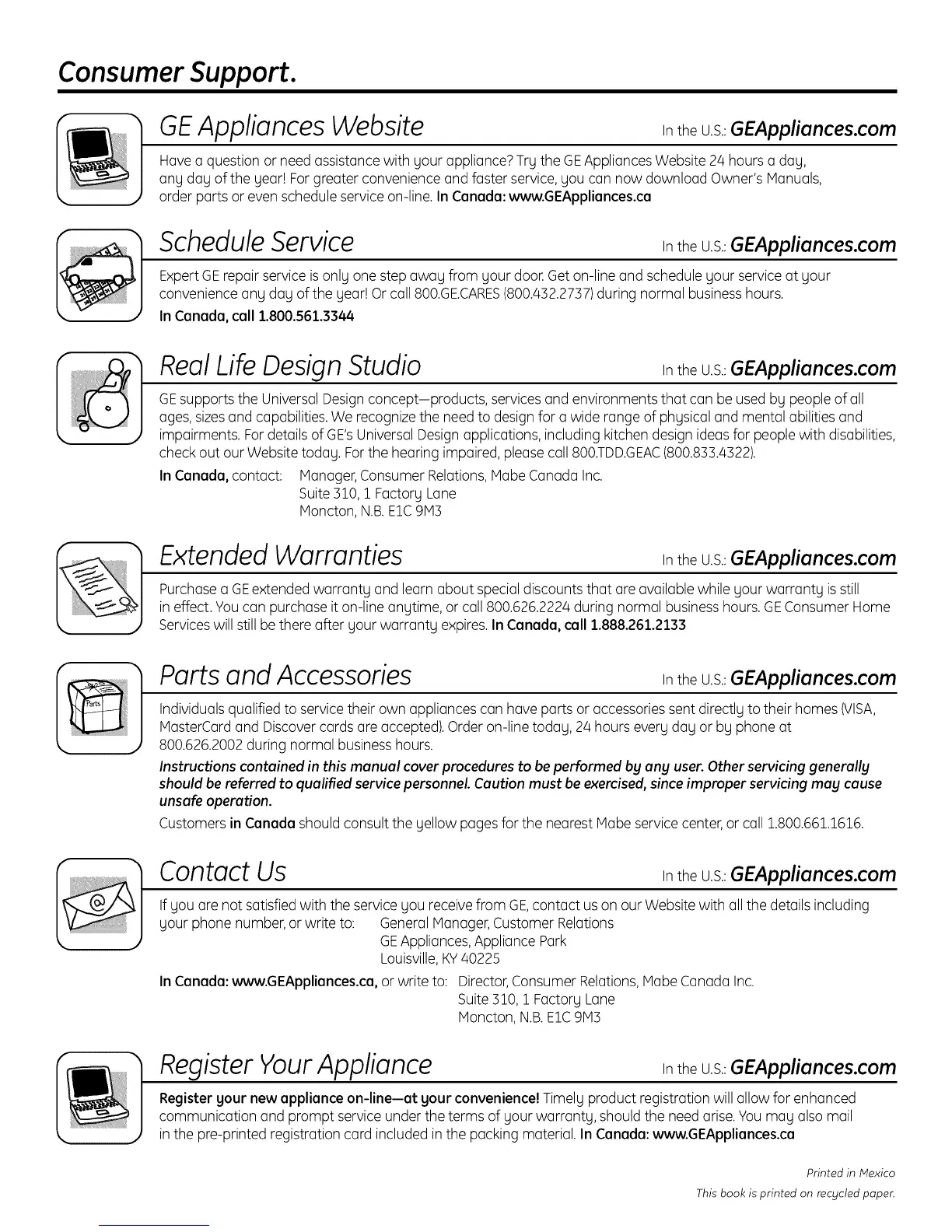 In Cenede: www.GEAppliences.ce, or write to: Director,Consumer Relations,Habe Canada Inc.